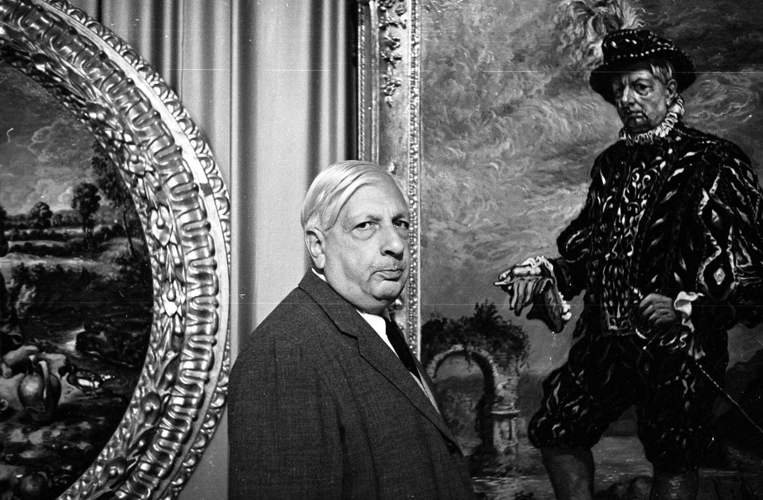 Black and white photograph of an older white man in a dark suit standing between two large old master paintings in an interior gallery setting