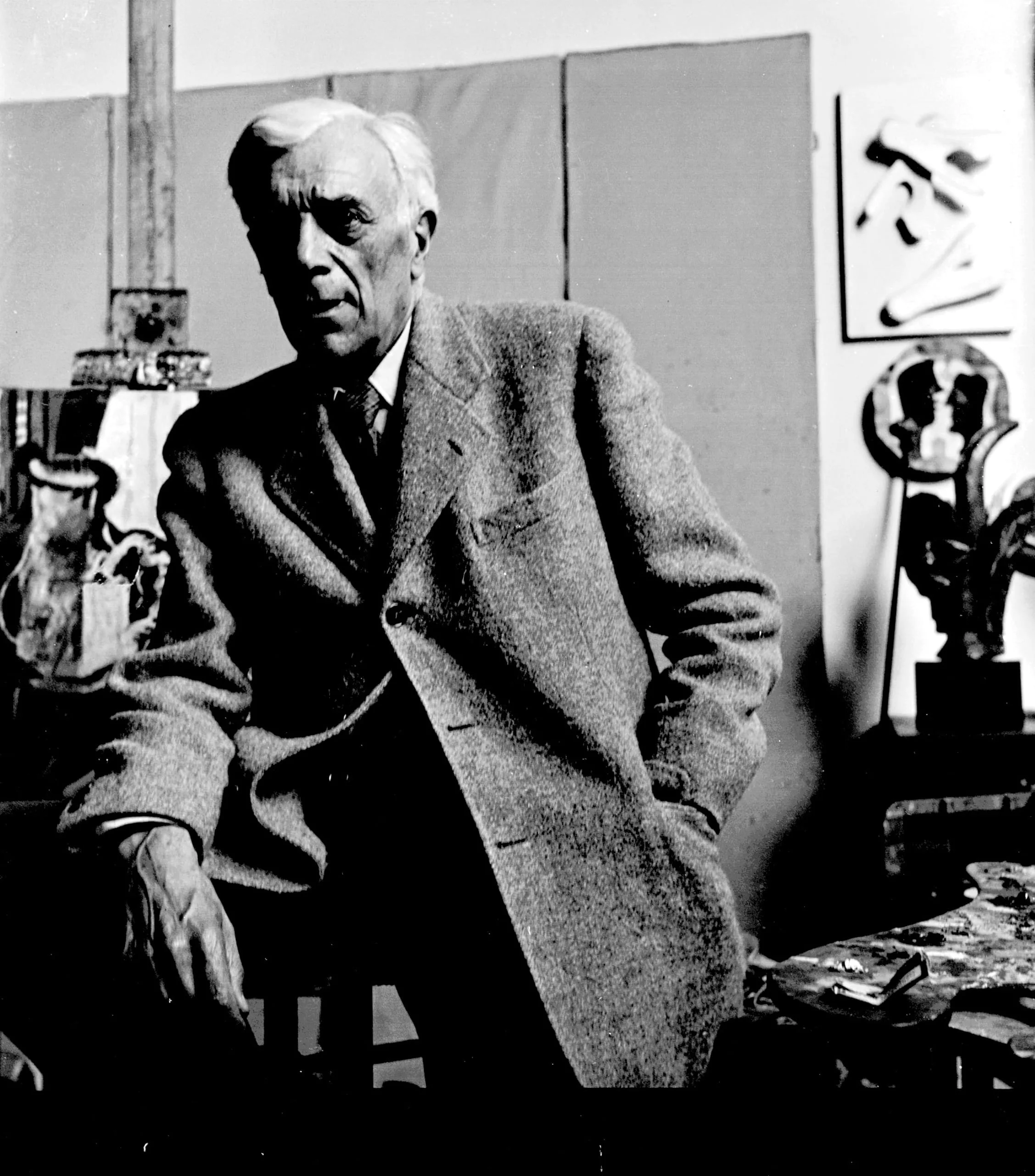 Black and white photograph of an elderly man in a wool jacket seated in an artist's studio, surrounded by sculptures and canvases