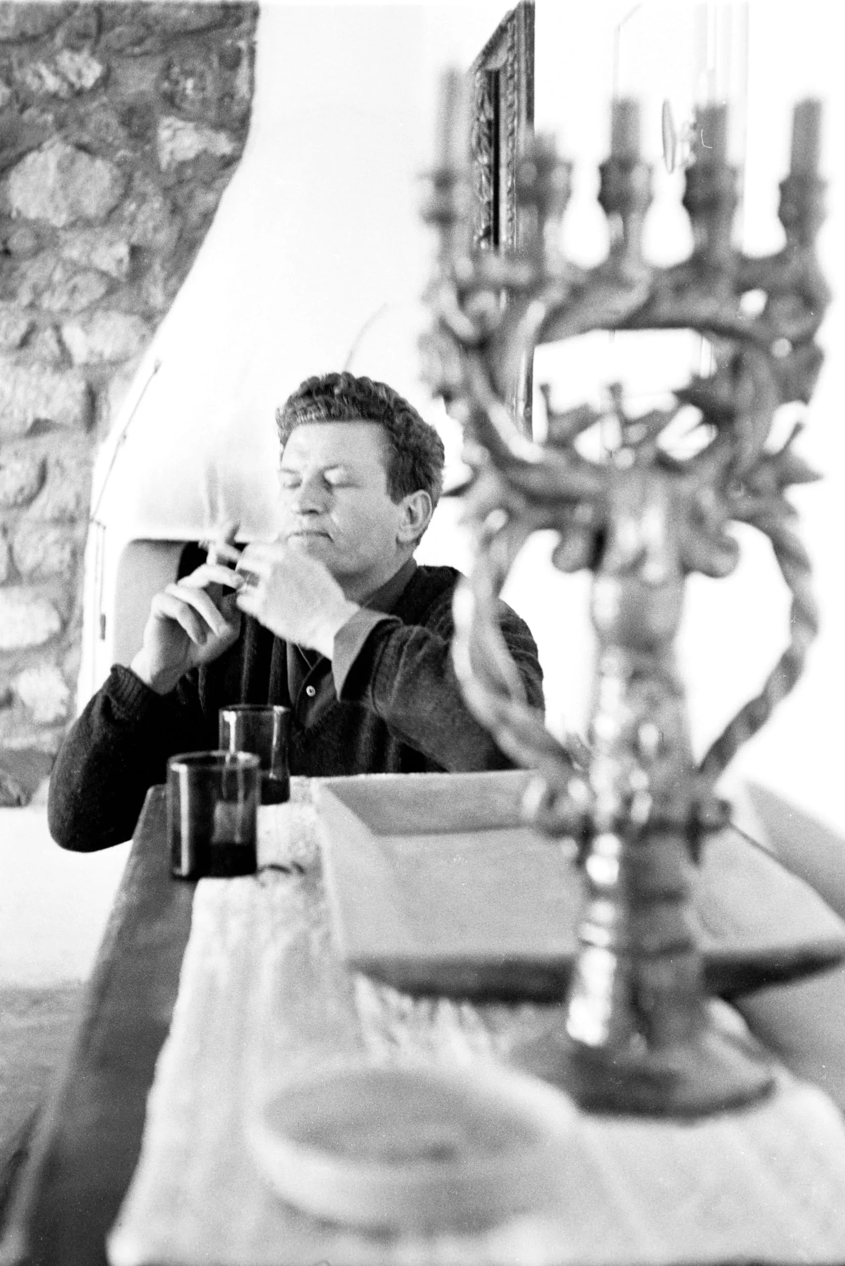 Black and white photograph of a man in a dark sweater seated at a wooden table, eyes closed, raising a cigarette to his lips, with an ornate candelabra blurred in the foreground
