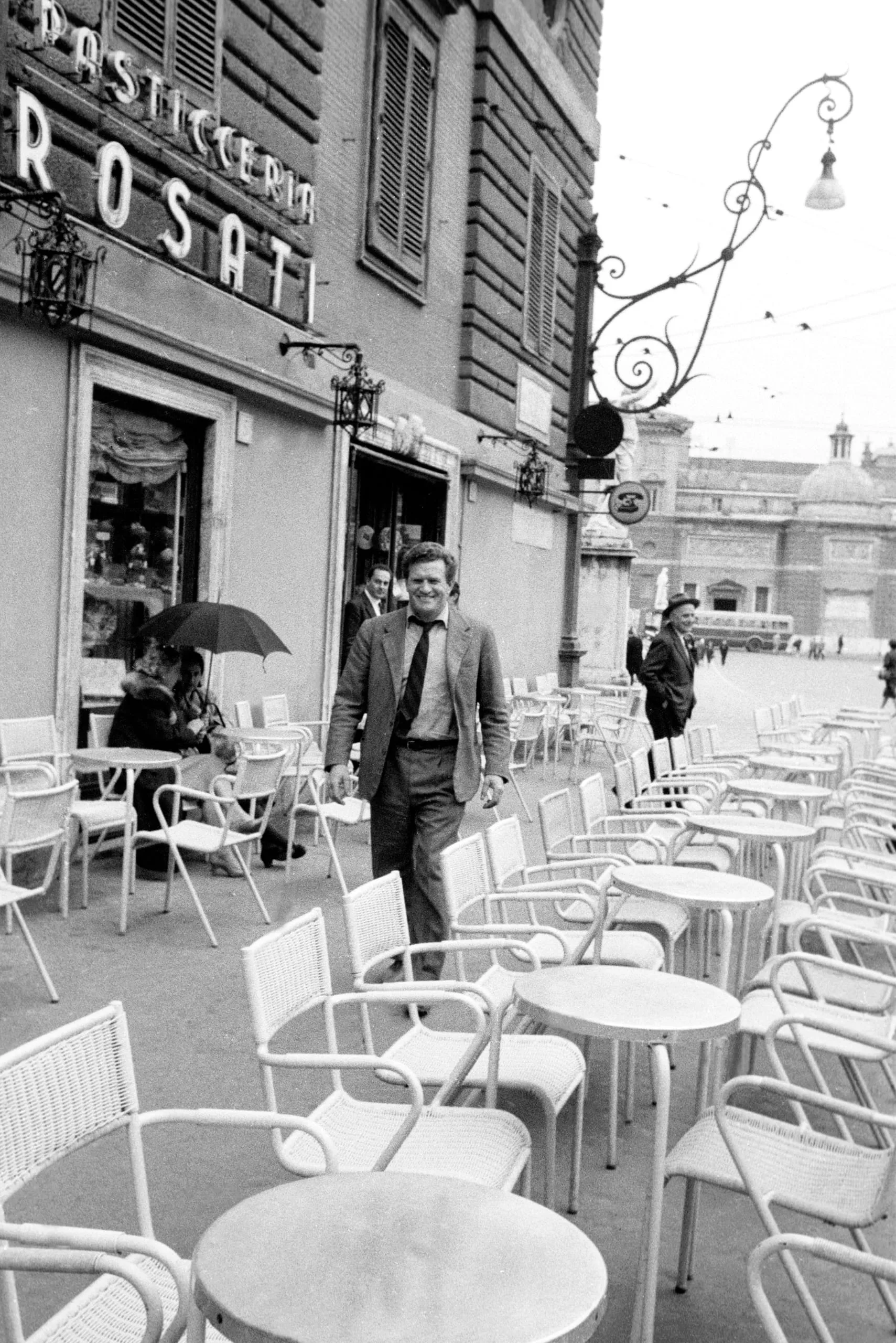Black and white photograph of a man in a blazer and tie walking toward the camera through an empty outdoor café terrace, with a storefront reading "ROSATI" behind him