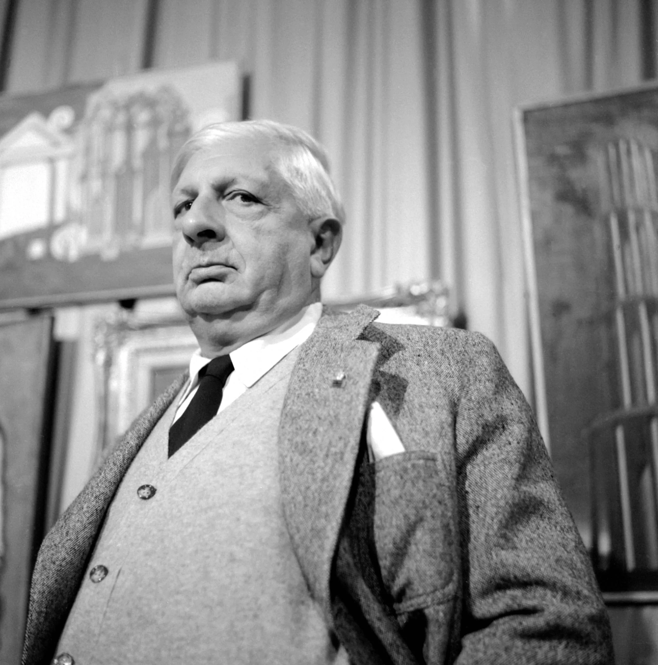 Black and white portrait photograph, heavyset man in gray tweed suit and dark tie, shot from below against out-of-focus framed paintings