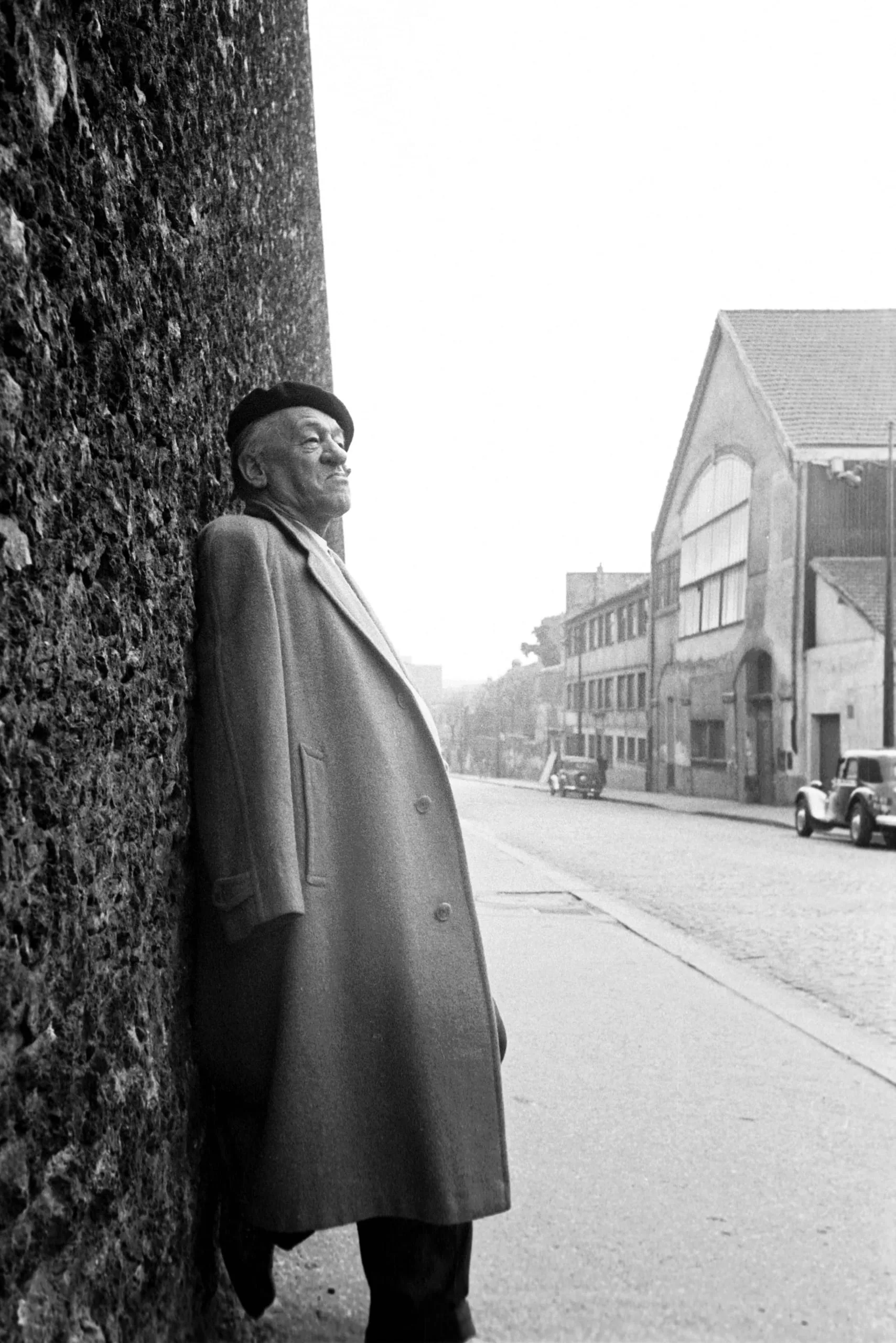 Black and white photograph of an older man in a long overcoat and flat cap leaning against a rough stone wall, head tilted back, with a European street receding behind him