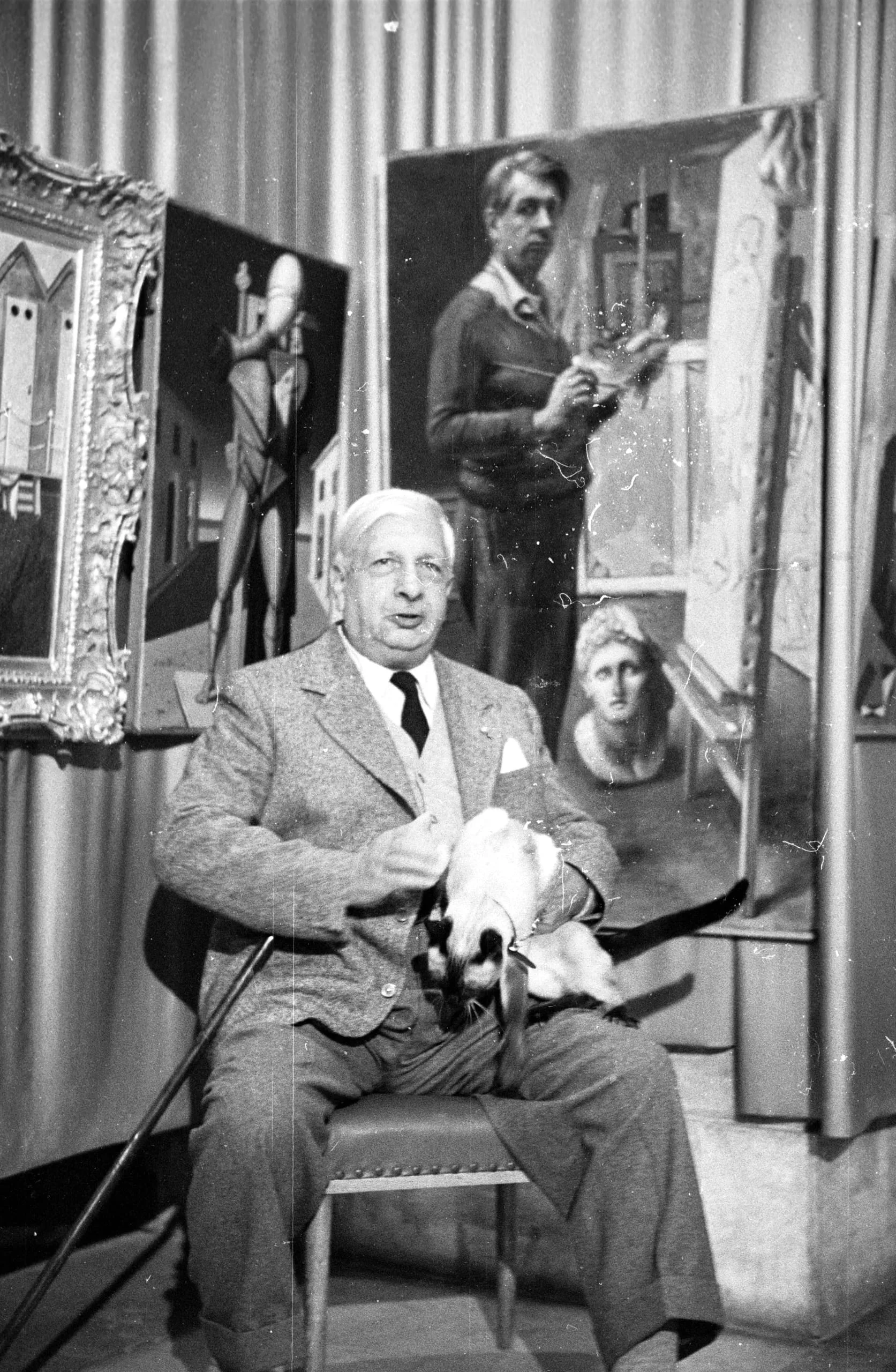 Black and white photograph of a seated older white man in a tweed suit holding a Siamese cat, surrounded by large figurative paintings on canvas