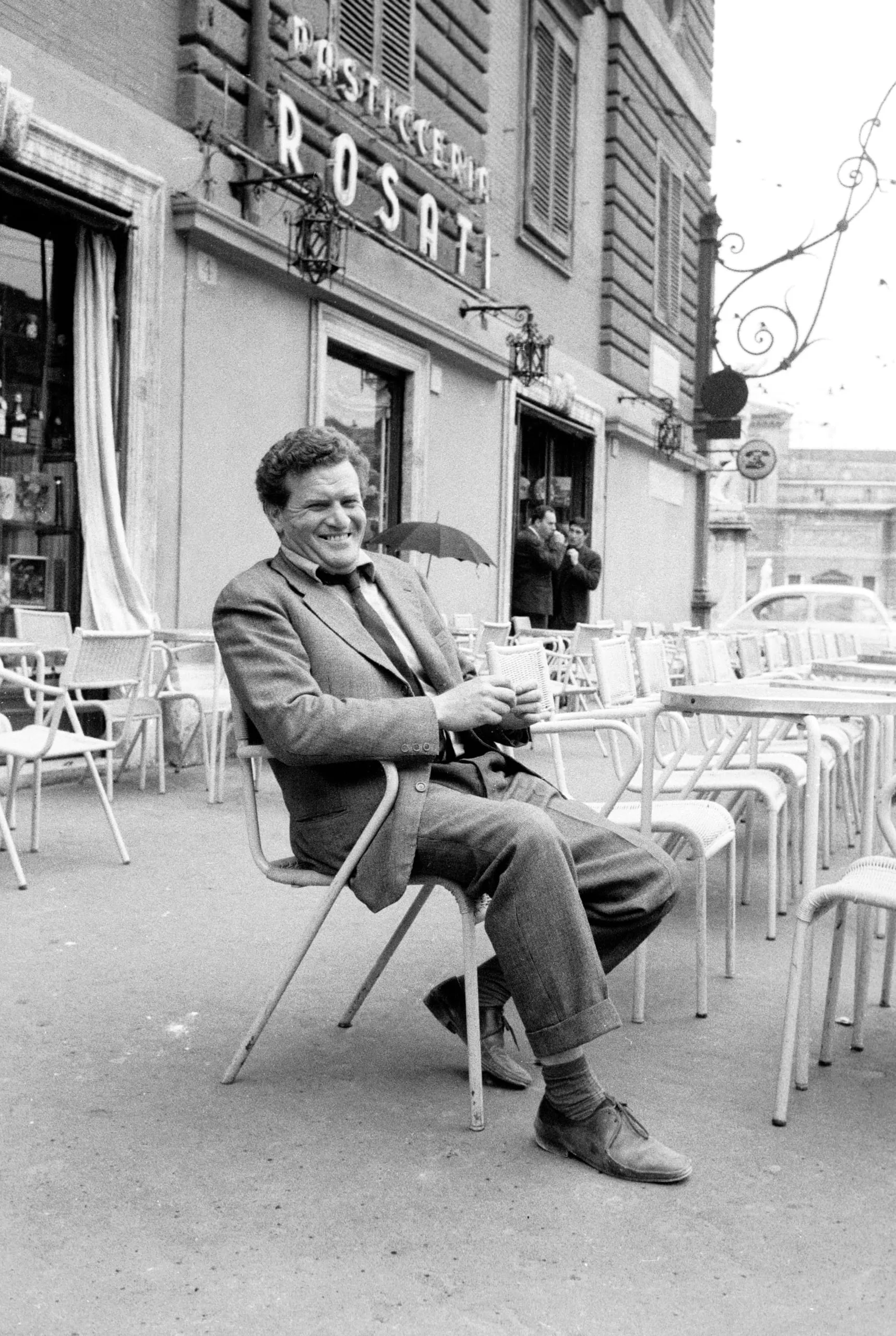 Black and white photograph of a smiling man in a sport coat and tie, seated alone at an outdoor café terrace beneath a sign reading 'ROSATI'