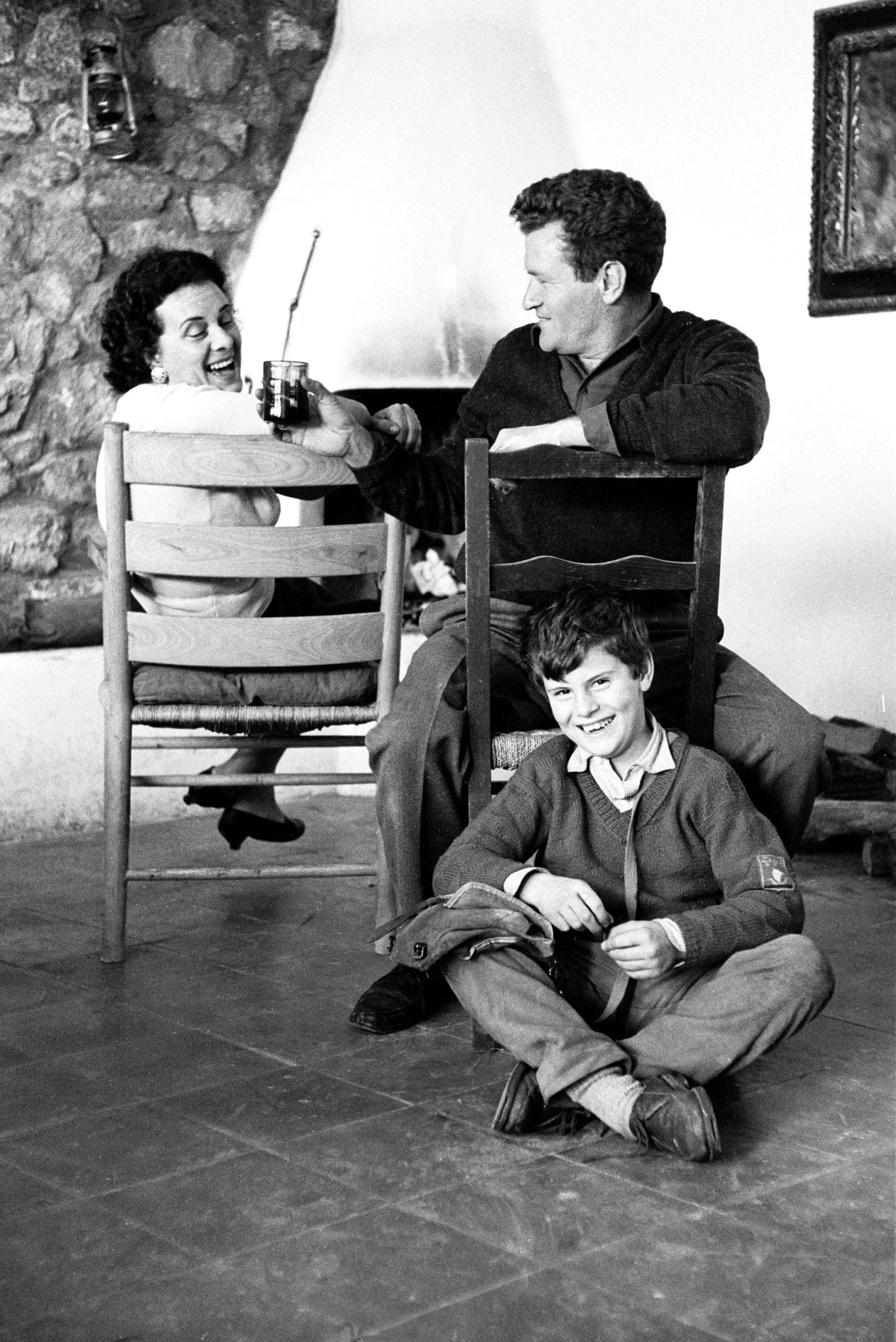 Black and white photograph of a woman, man, and boy in a rustic interior; woman sits backward in a chair laughing, man leans on the chair back, boy sits cross-legged on a tiled floor smiling upward