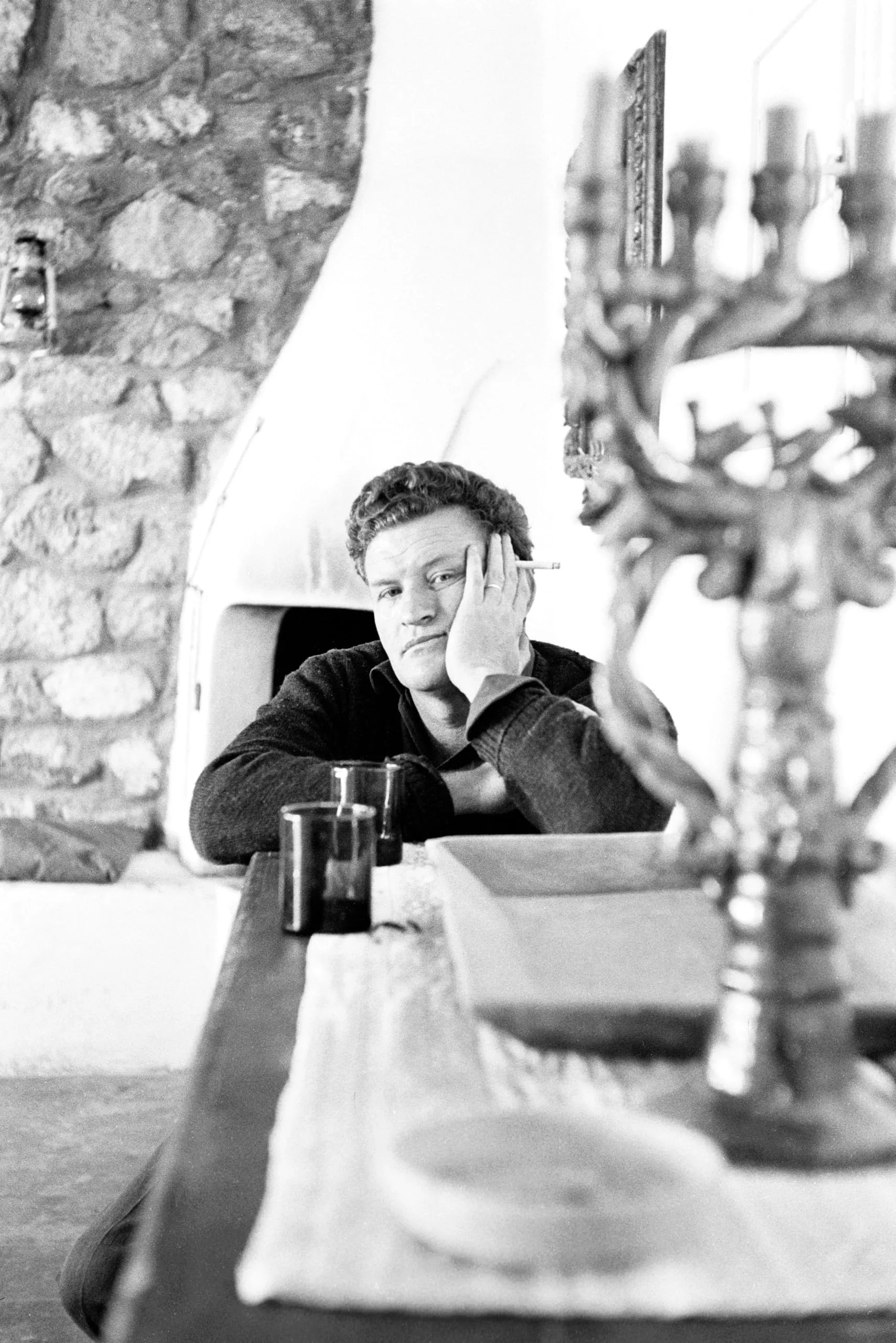 Black and white photograph of a man resting his cheek on his hand at a long table, cigarette in hand, with a stone interior and ornate candelabra nearby
