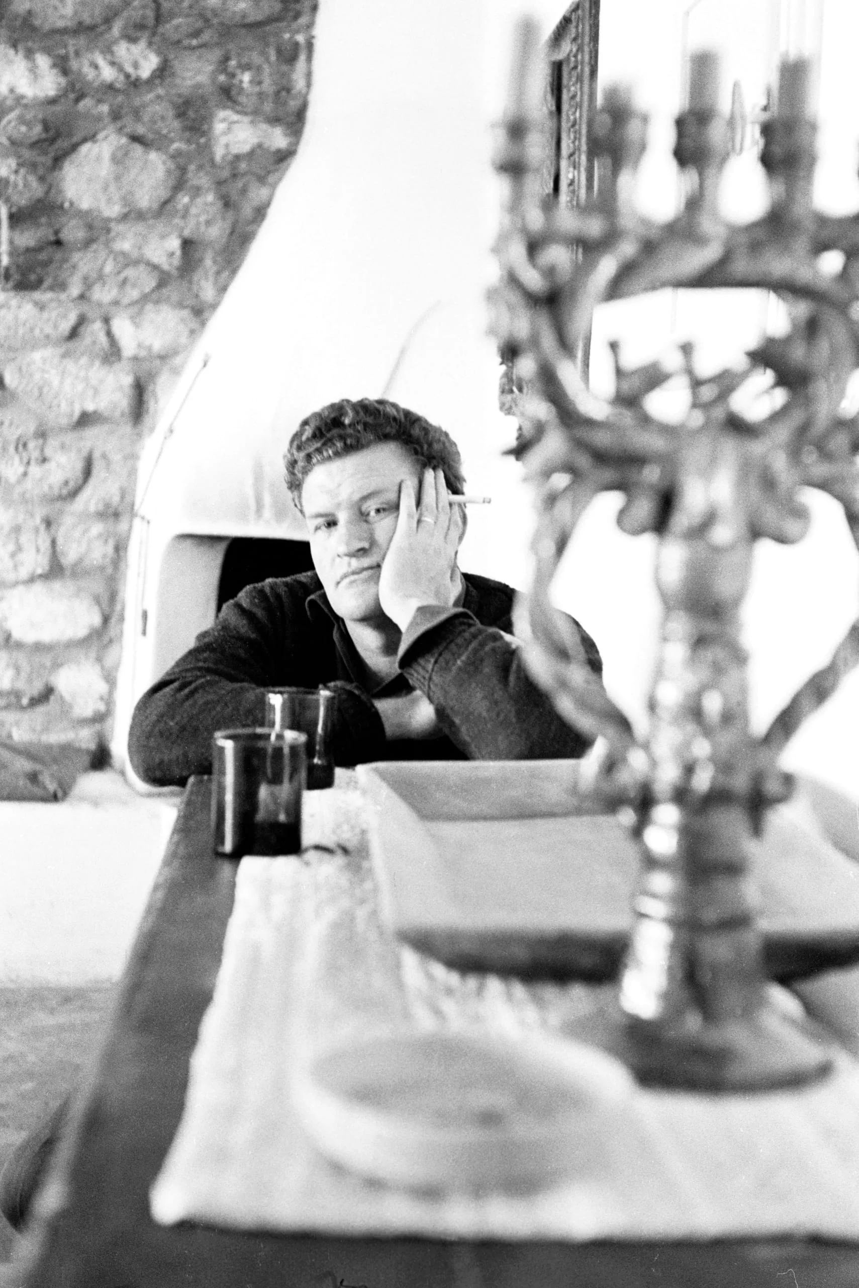 Black and white photograph of a young white man seated at a long table, resting his cheek on one hand and holding a cigarette, with a candelabra in the foreground