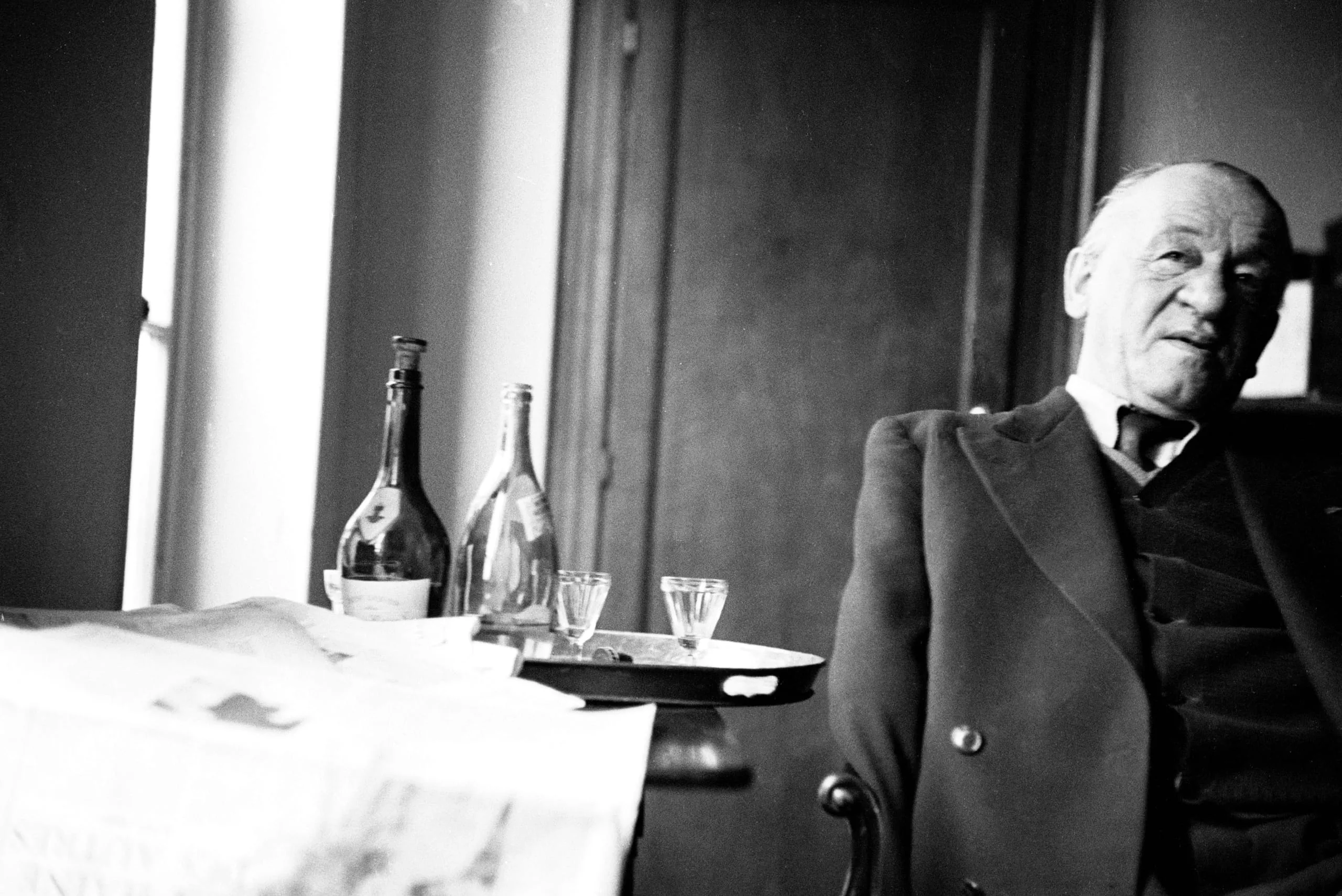 Black and white photograph of an elderly man seated in a chair beside a table holding two bottles and small glasses on a tray, lit by a bright window