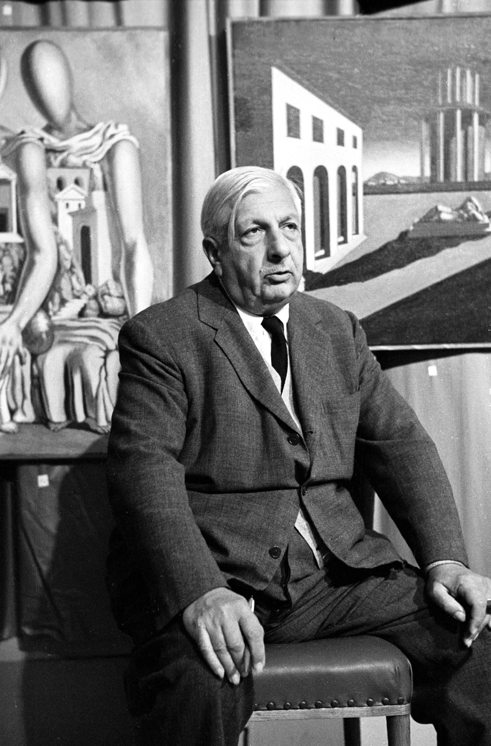 Black and white photograph of a heavyset, older white man in a gray suit seated in front of two large surrealist paintings