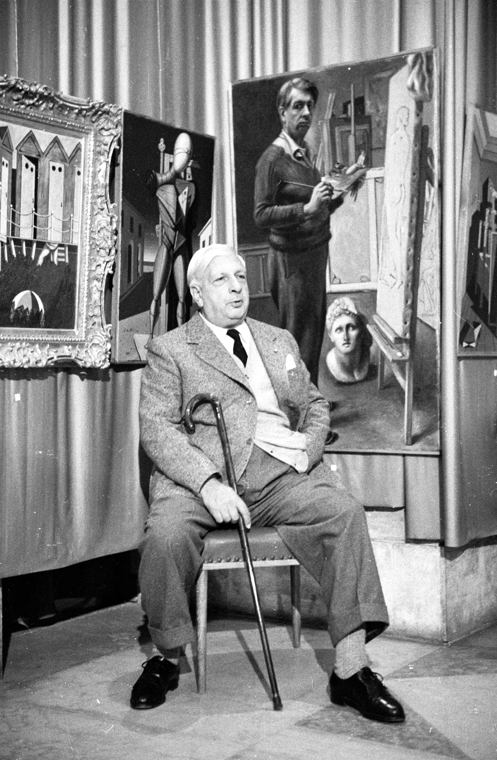 Black and white photograph of a heavyset older man in a light suit seated in a wooden chair, holding a cane, surrounded by large figurative and architectural paintings