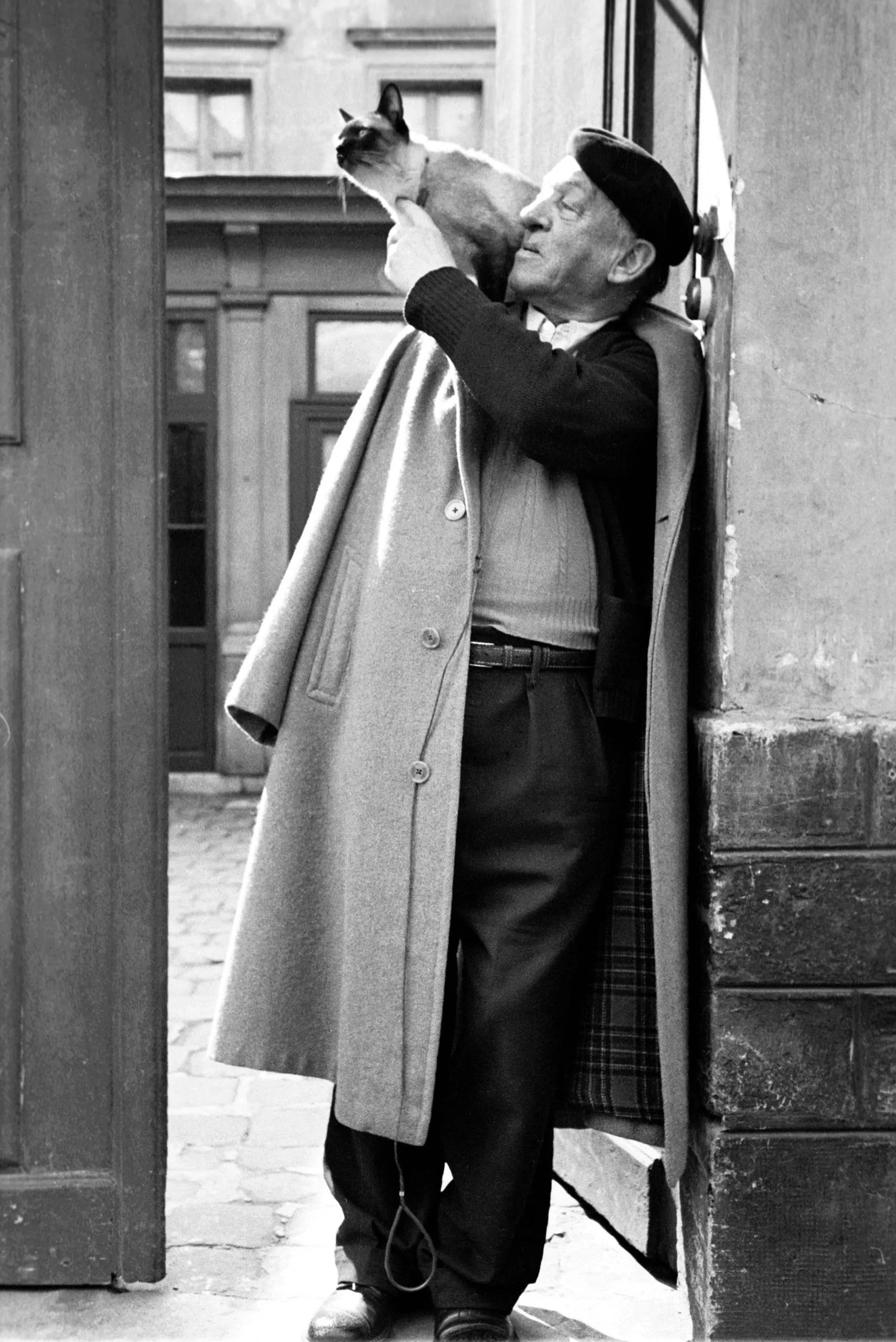 Black and white photograph of an older man in a beret and long overcoat, standing in a doorway and holding a Siamese cat up to his face