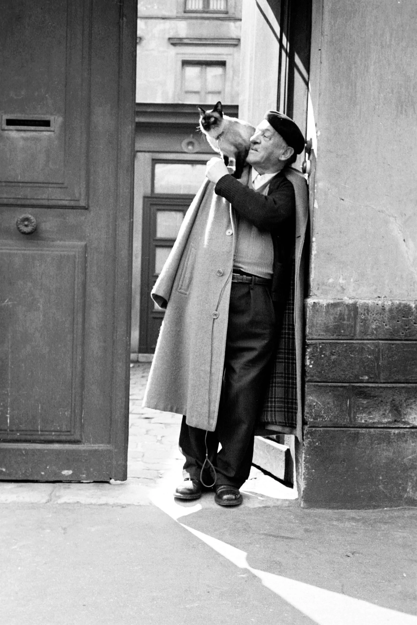 Black and white photograph of an older man in a flat cap and overcoat holding a Siamese cat up to his face in a stone doorway