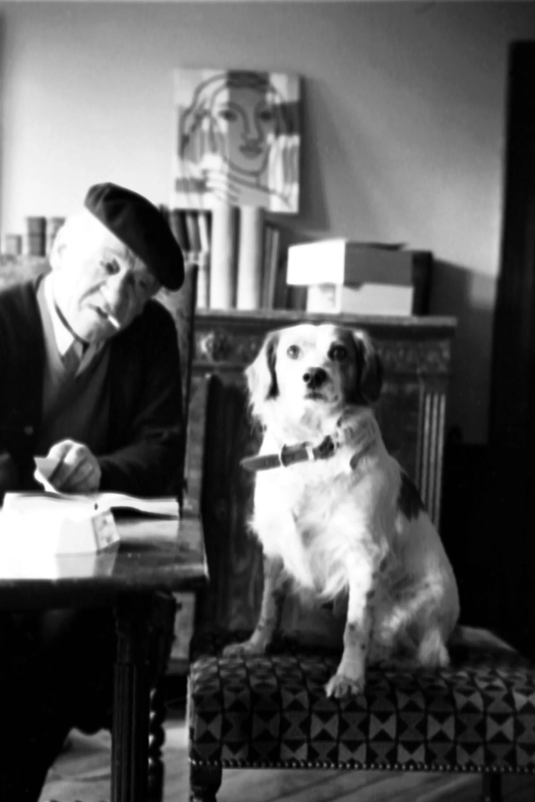 Black and white photograph of an older man in a beret smoking at a table, seated beside a spaniel-type dog perched on a patterned stool, interior setting with a graphic portrait painting visible in the background