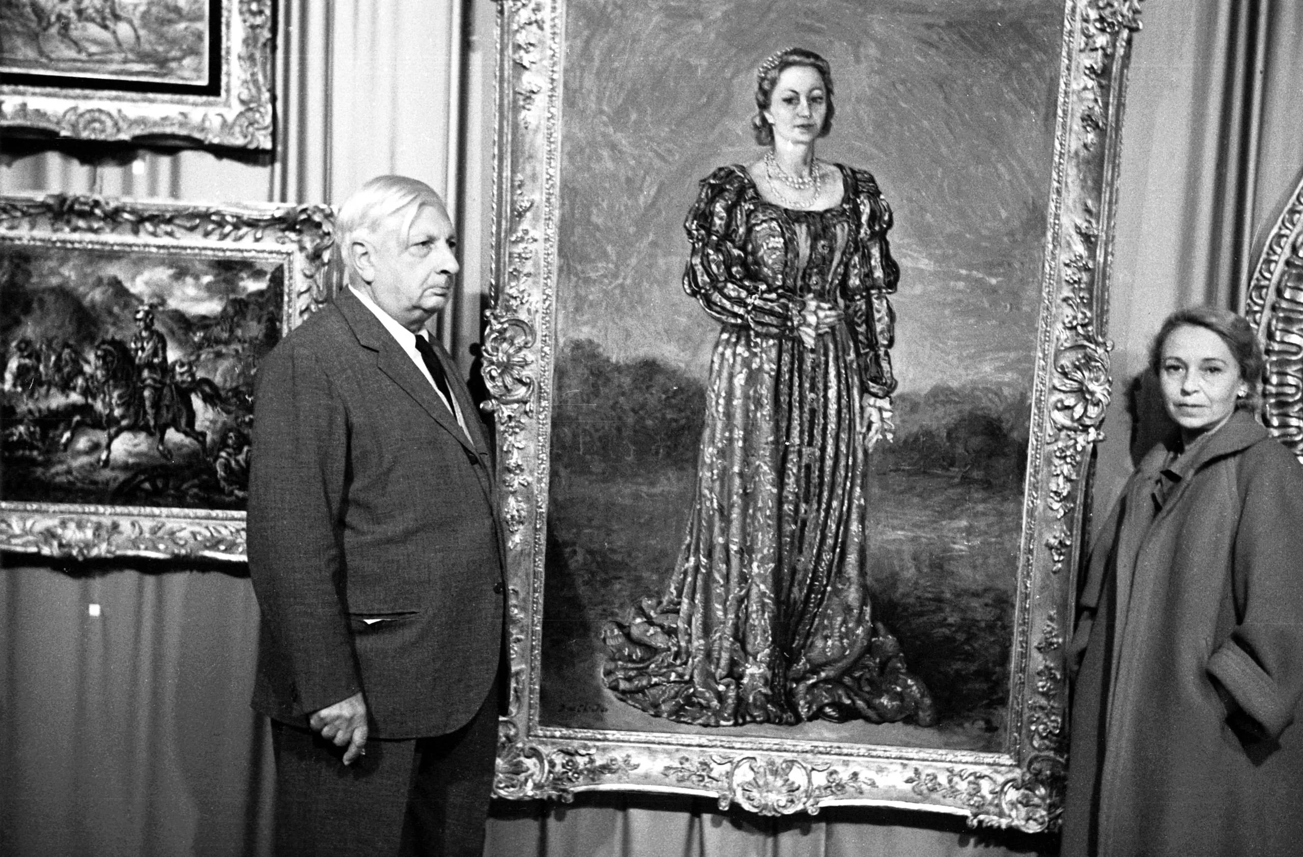 Black and white photograph of a man and woman standing on either side of a large gilt-framed portrait painting of a woman in a floor-length patterned gown with puffed sleeves