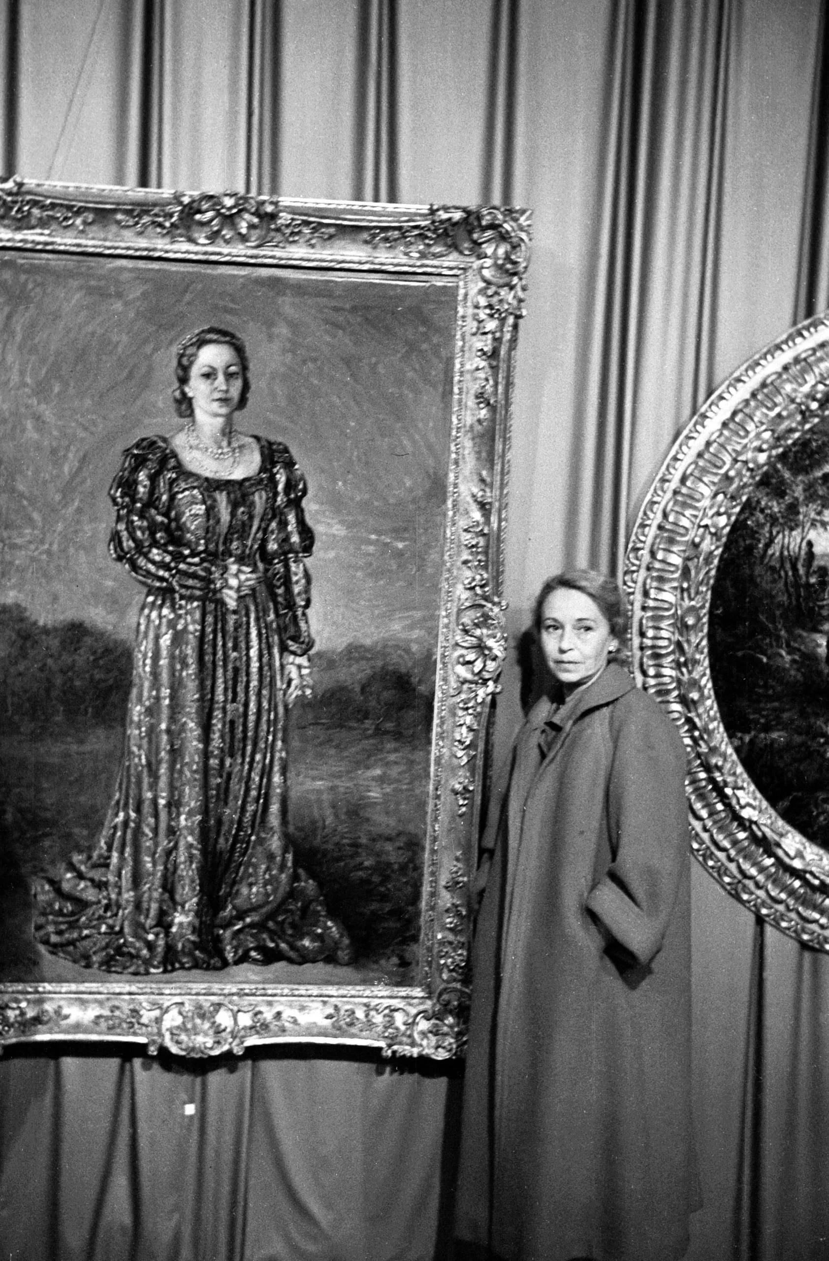 Black and white photograph of a woman in a long coat standing beside a large gilt-framed oil painting depicting a full-length female portrait in a satin gown