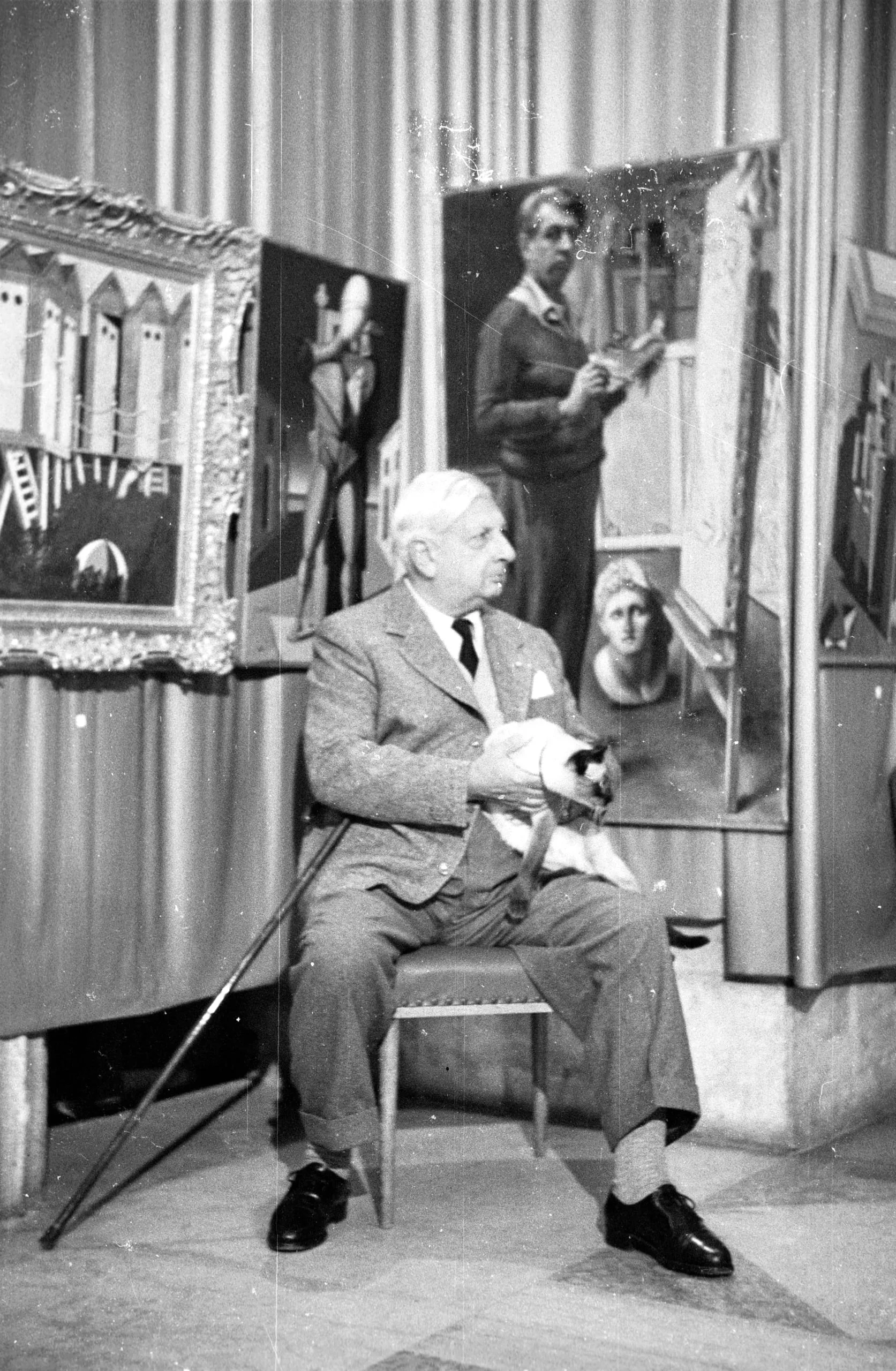 Black and white photograph of an elderly man in a suit seated in a chair holding a cat, surrounded by large paintings in a gallery or studio setting
