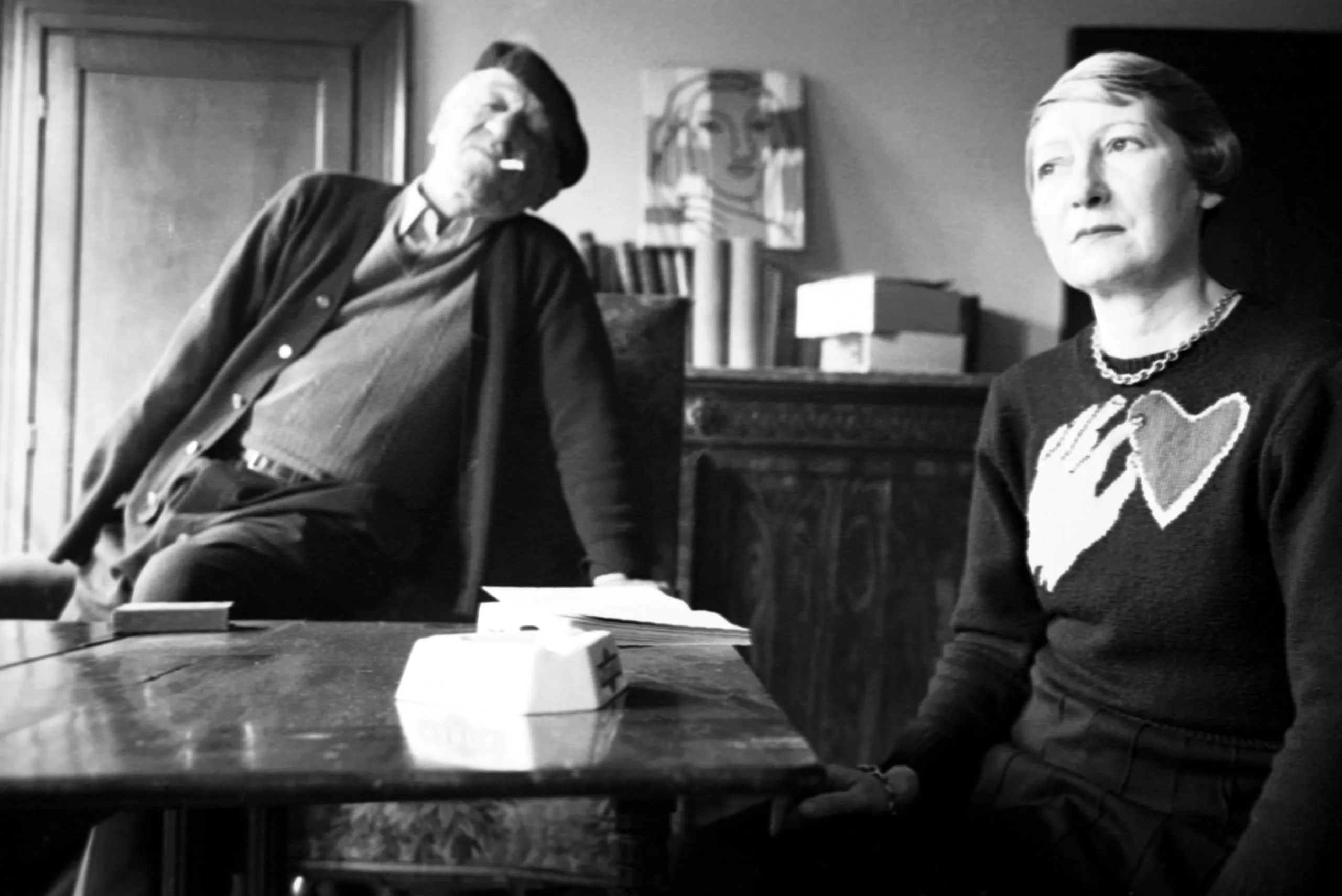 Black and white photograph of a man leaning back in a chair with a cigarette and a woman in a heart-motif sweater seated near a wooden table indoors
