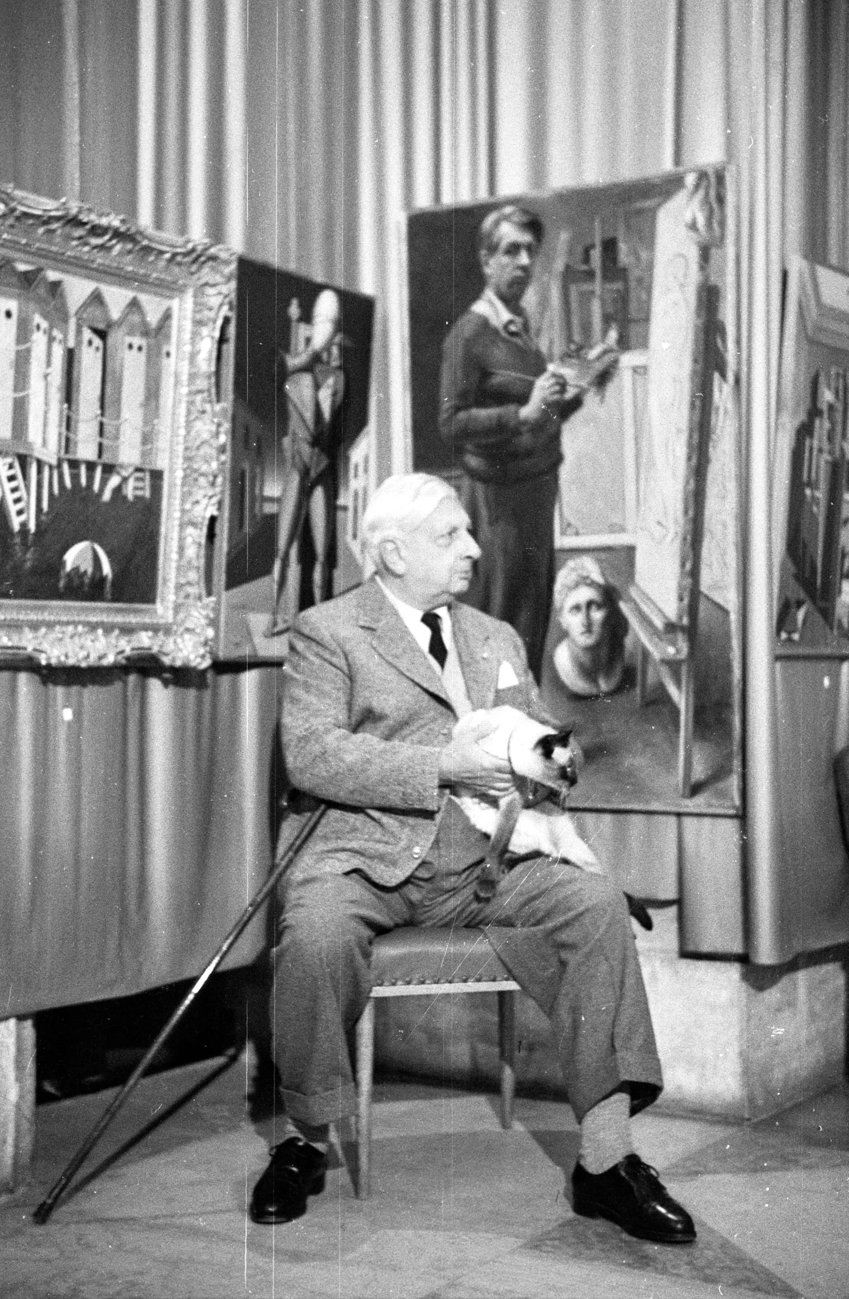 Black and white photograph of an elderly man in a tweed suit seated in a chair holding a cat, surrounded by large paintings on easels
