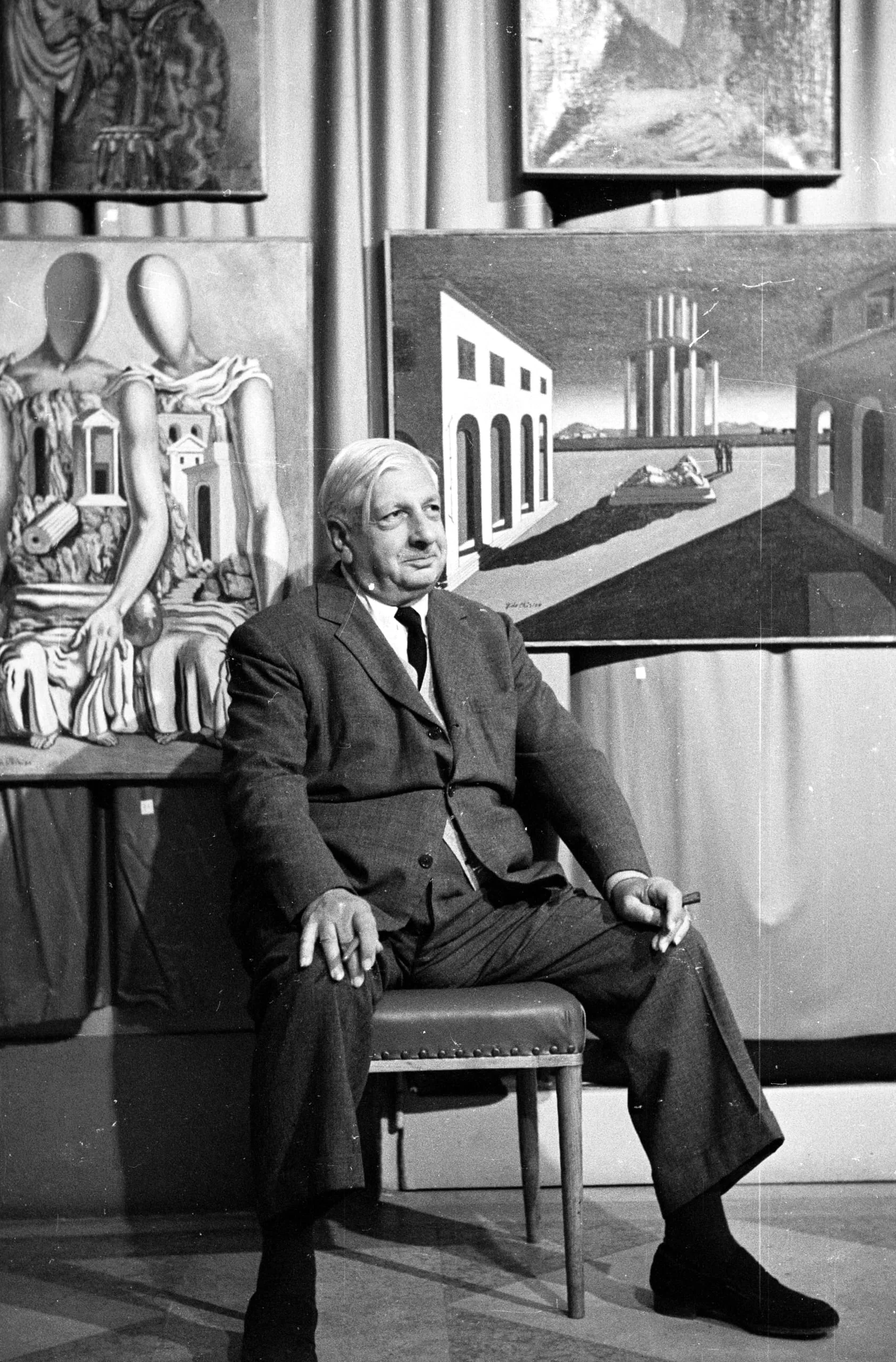 Black and white photograph of a white-haired man in a three-piece suit seated in a chair, holding a cigarette, surrounded by Surrealist-style paintings in a studio