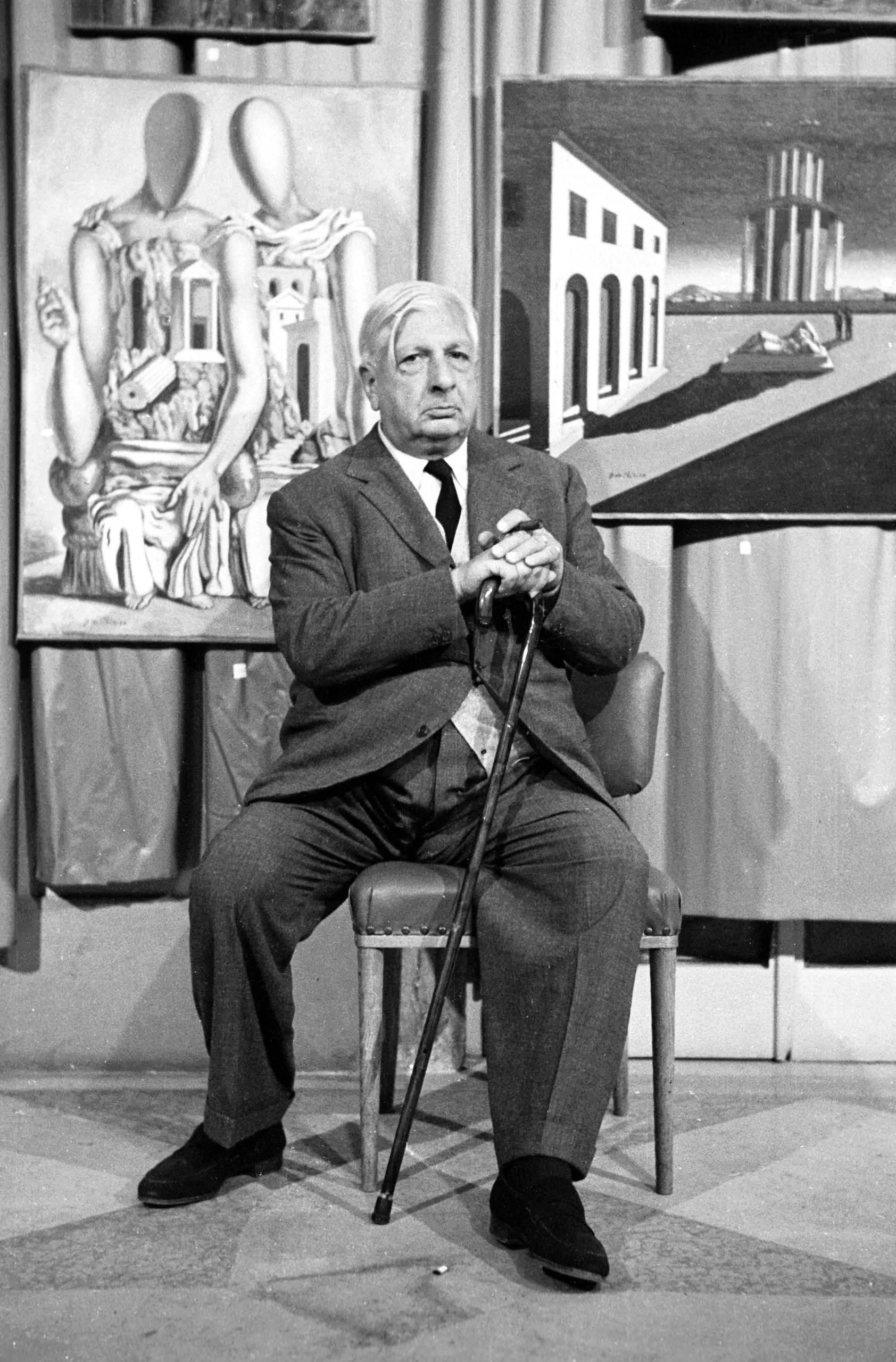 Black and white photograph of an elderly man in a gray suit seated on a stool, hands folded on a cane, with two large Surrealist-style paintings visible behind him