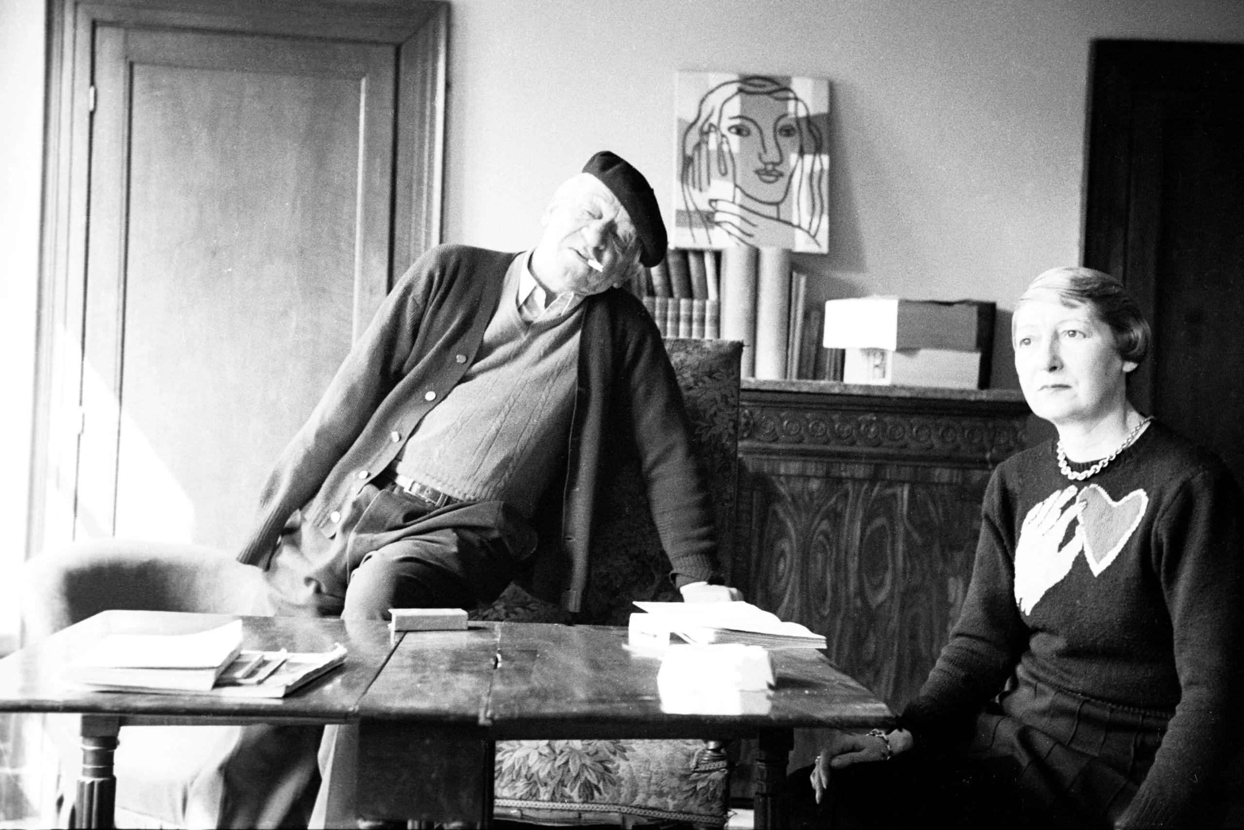 Black and white photograph of an older man leaning on a paper-strewn desk with eyes closed beside an older woman seated and looking at camera, interior room with framed modernist drawing on wall behind them