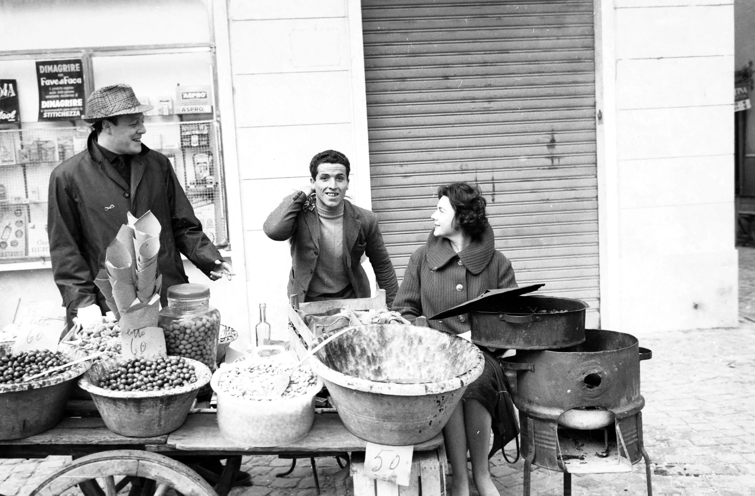 Black and white photograph of three people at an outdoor market cart stacked with bowls of olives, smiling and talking, with a shuttered storefront behind them