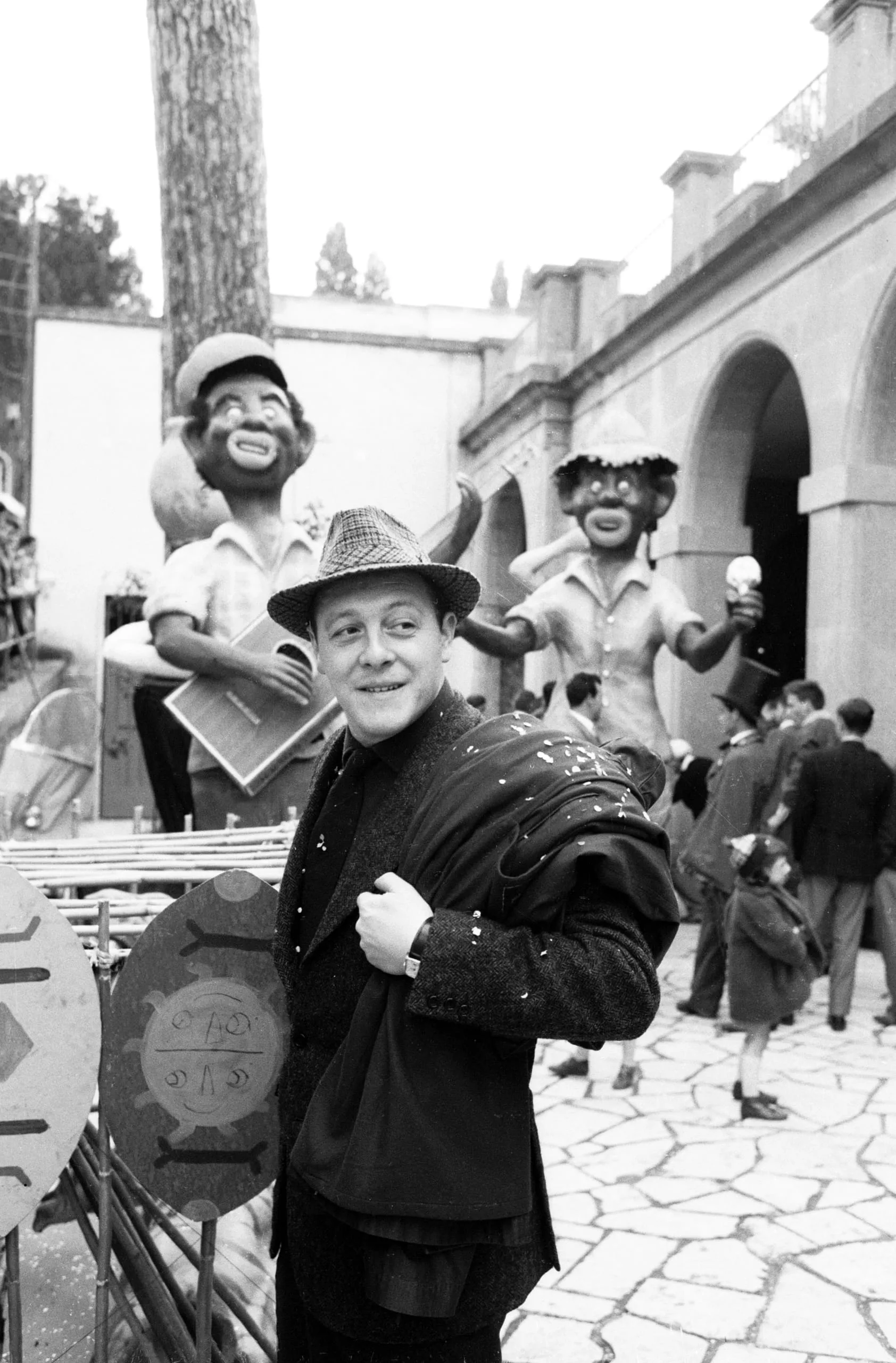 Black and white photograph of a smiling white man in a fedora and dark jacket holding a coat, with oversized carnival figures looming behind him in an outdoor courtyard