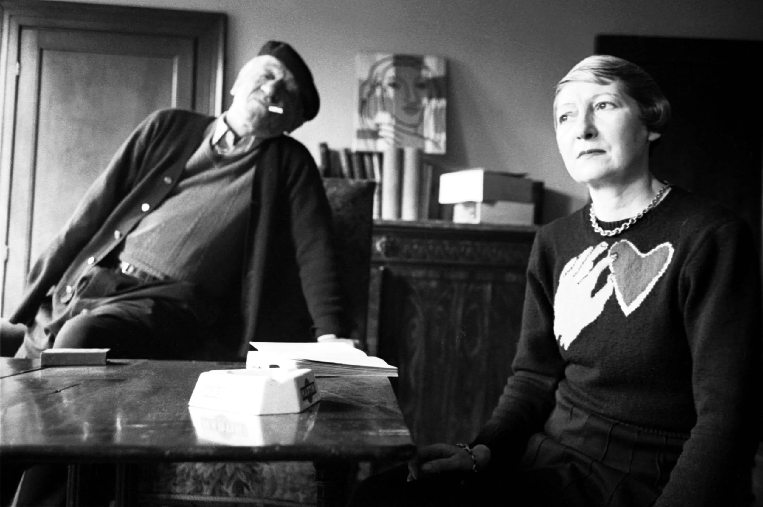 Black and white photograph of two people in an interior room: a woman in a heart-motif sweater seated in the foreground, a man in a flat cap reclining behind her