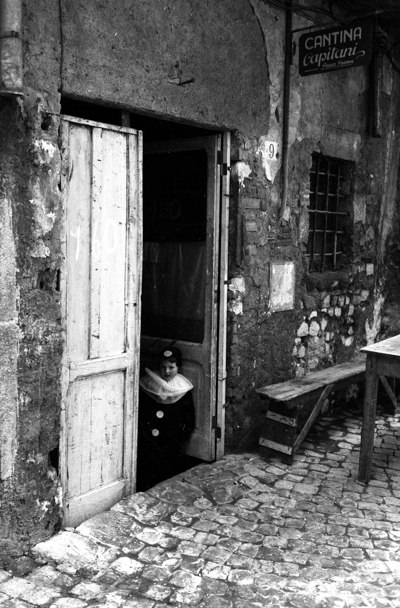 Black and white photograph of a deteriorating stone building facade, with a young child peering around an open wooden door on a cobblestone street