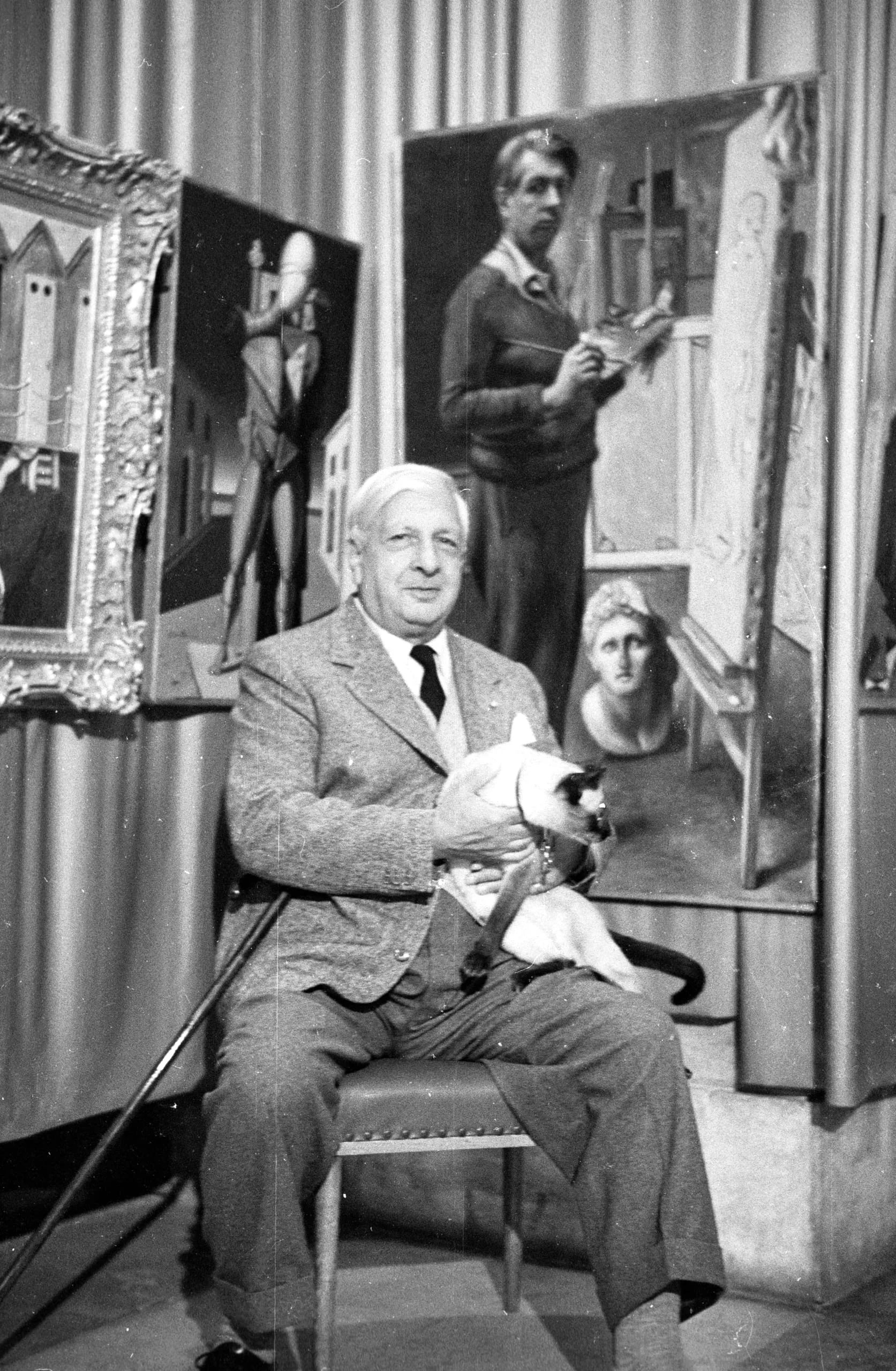 Black and white photograph of a heavyset older man seated and holding a Siamese cat, surrounded by figurative paintings in a studio setting
