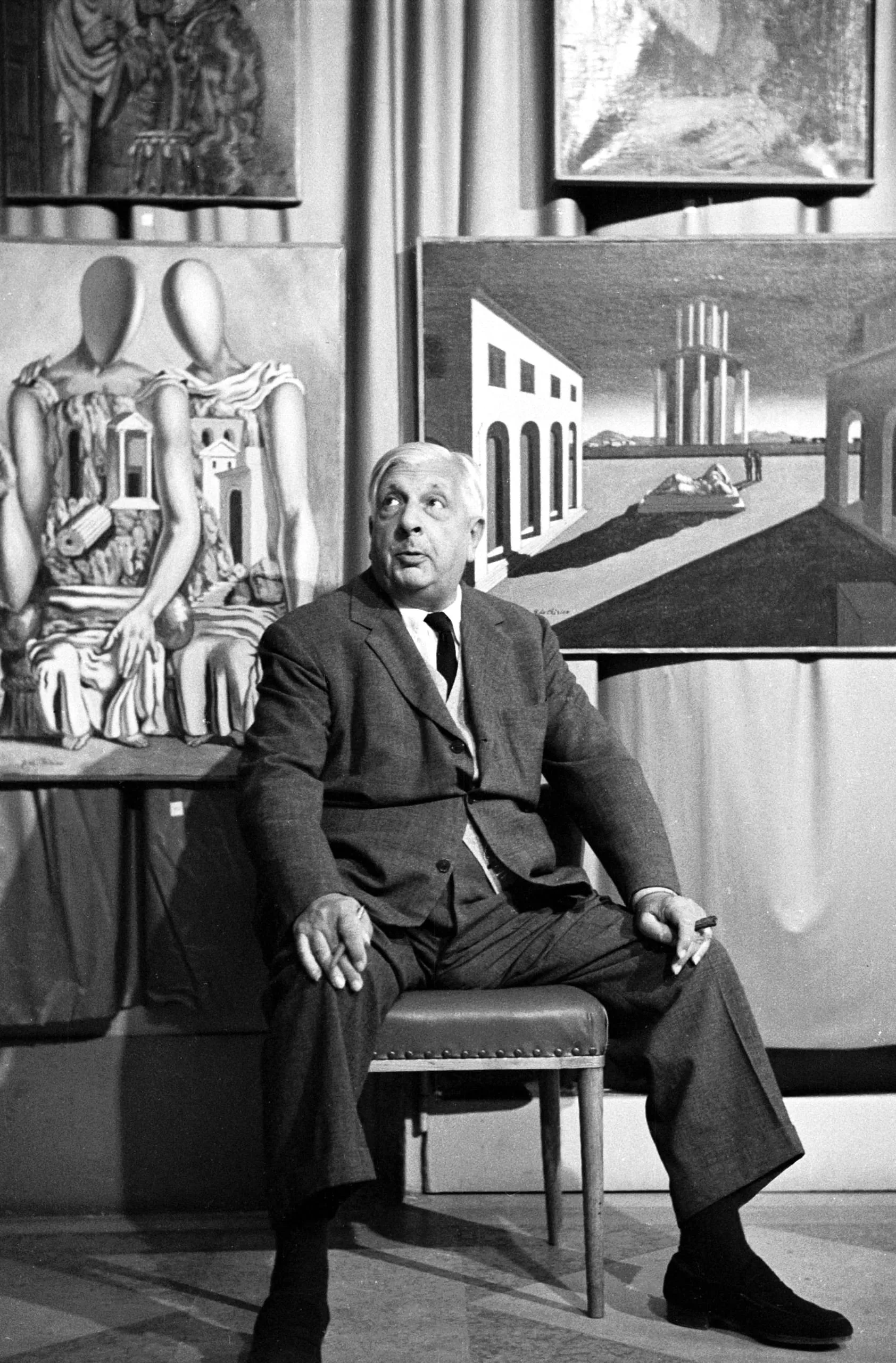 Black and white photograph, heavyset man in a suit seated on a low bench, looking up and to the right, surrounded by large Surrealist and Metaphysical paintings