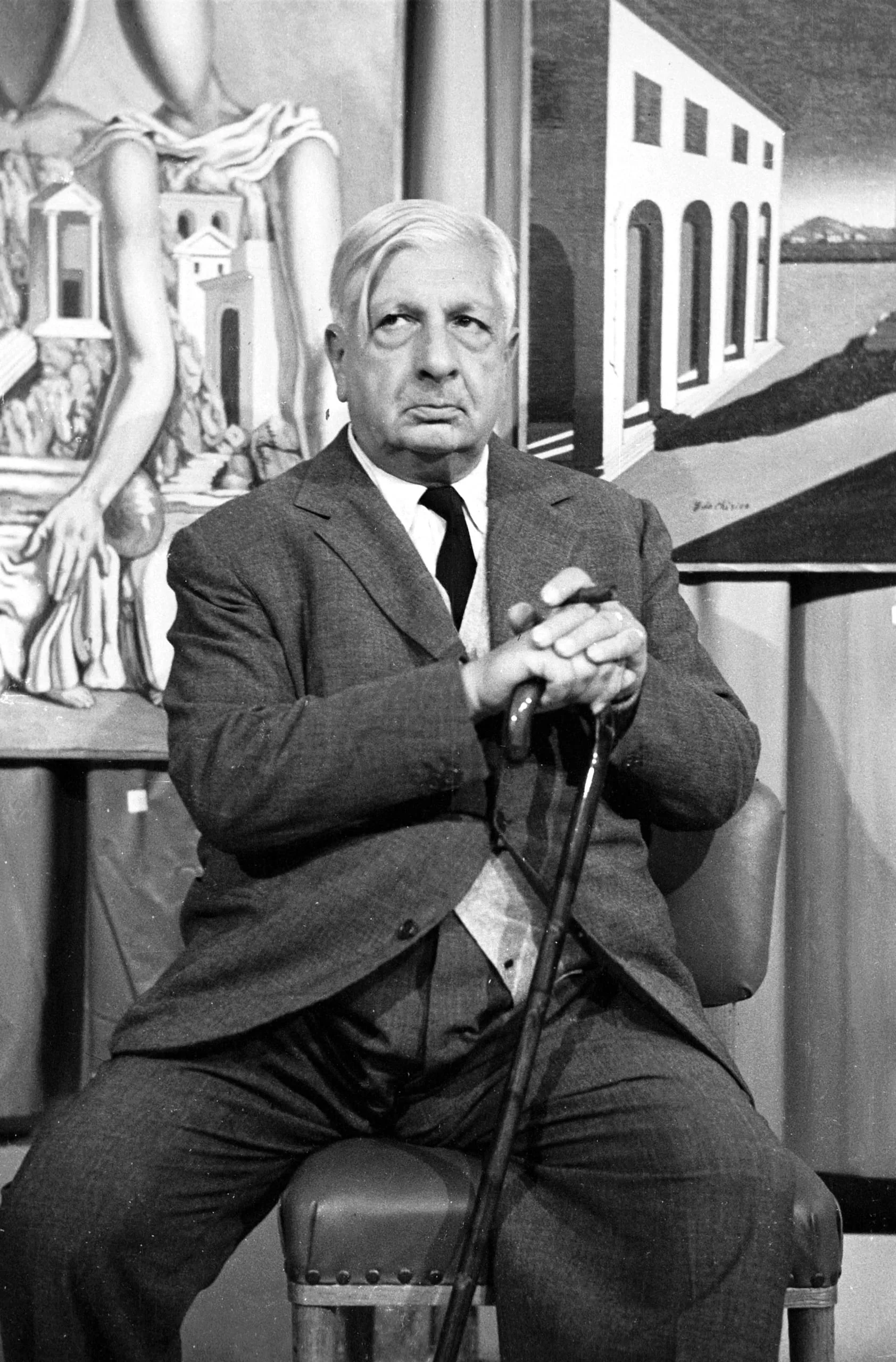Black and white photograph of a heavyset older man seated on a stool, hands folded over a cane, with two large figurative paintings visible behind him