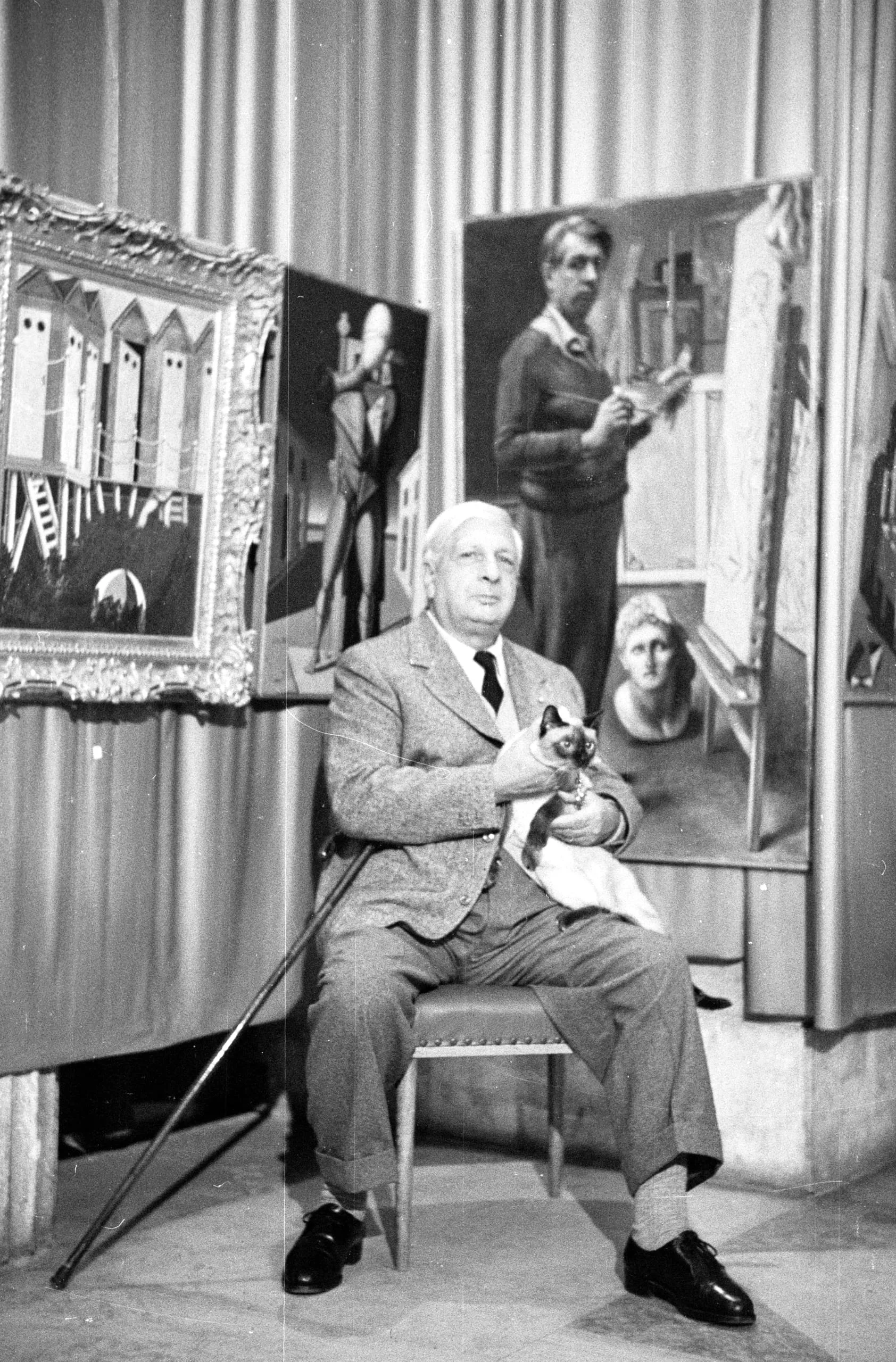 Black and white photograph of an older man seated and holding a Siamese cat, surrounded by large paintings on easels against draped curtains