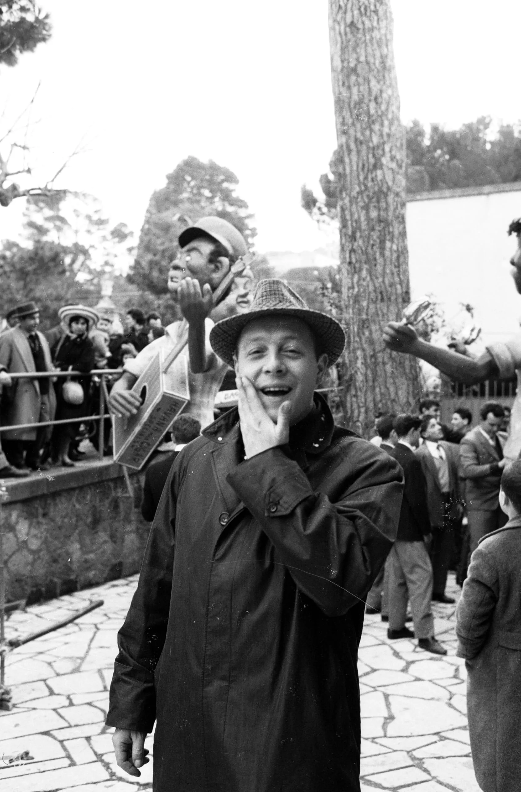 Black and white photograph of a smiling white man in a fedora and dark overcoat pressing his hand to his cheek, surrounded by a crowd outdoors