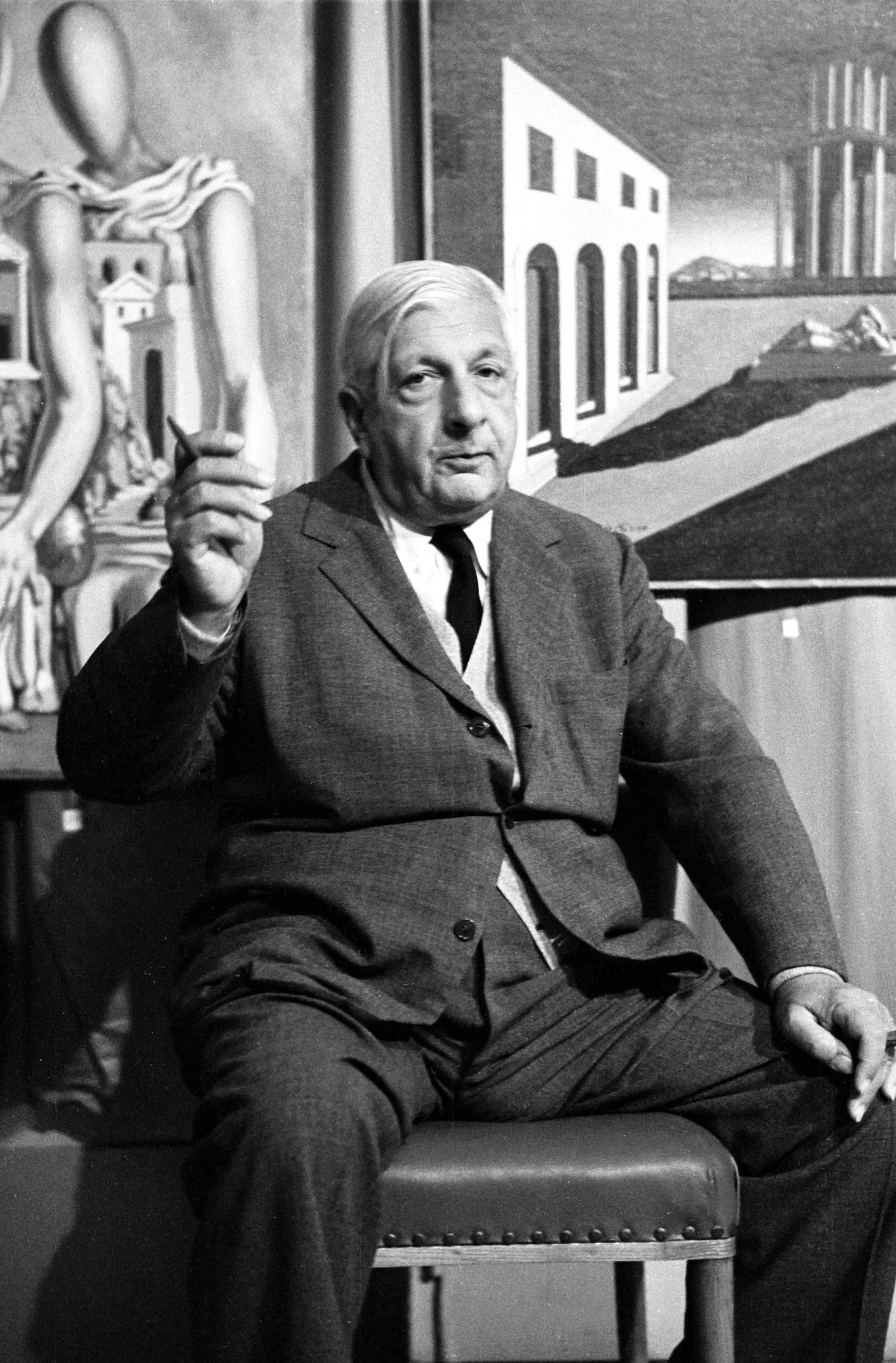 Black and white photograph of an older white man in a double-breasted suit seated in a studded leather chair, one hand raised with index finger pointing upward, two surrealist-style paintings visible behind him
