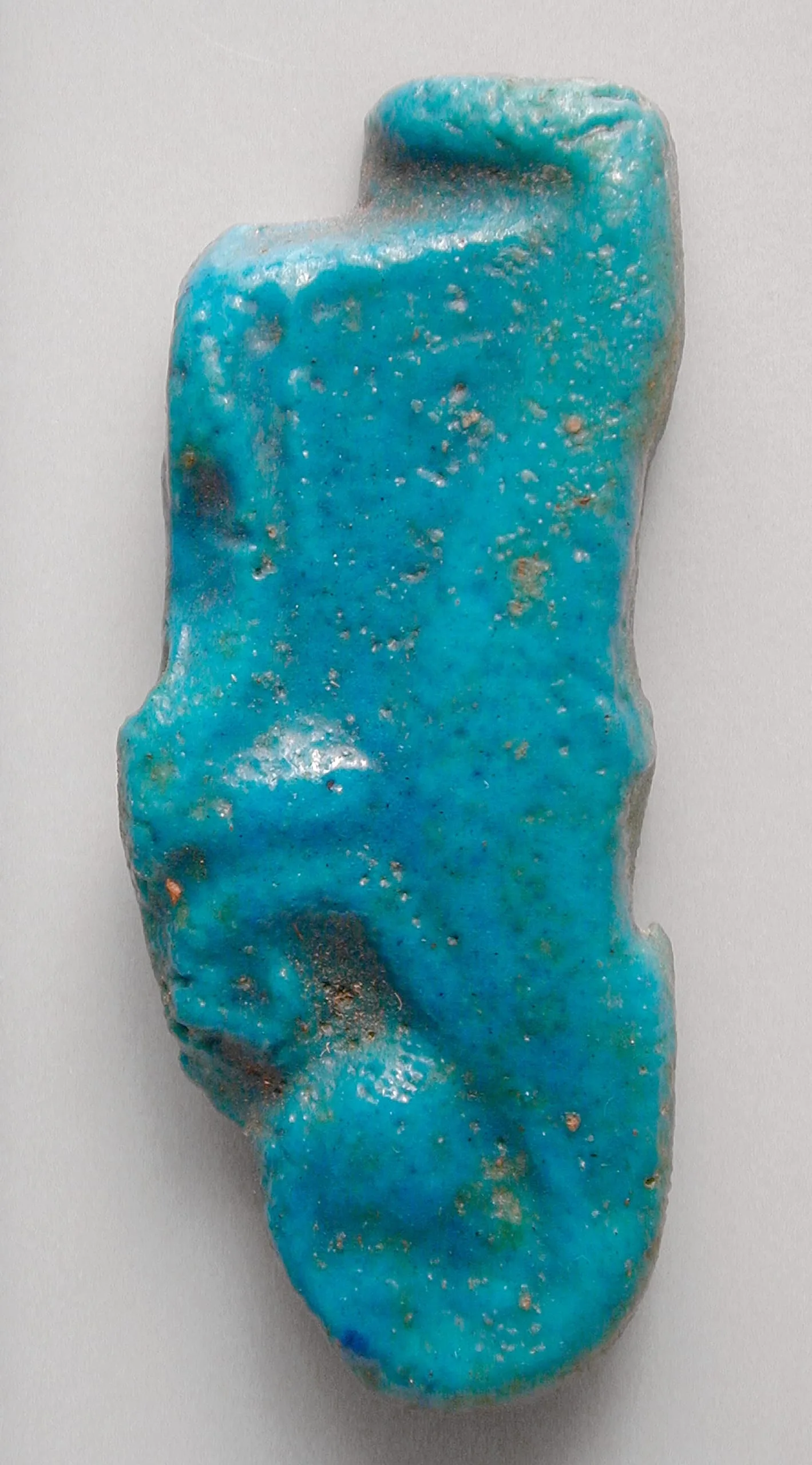 Small Egyptian faience amulet in turquoise blue glaze, molded in the form of a human figure in profile, with a suspension loop at the upper right and worn, pitted surface