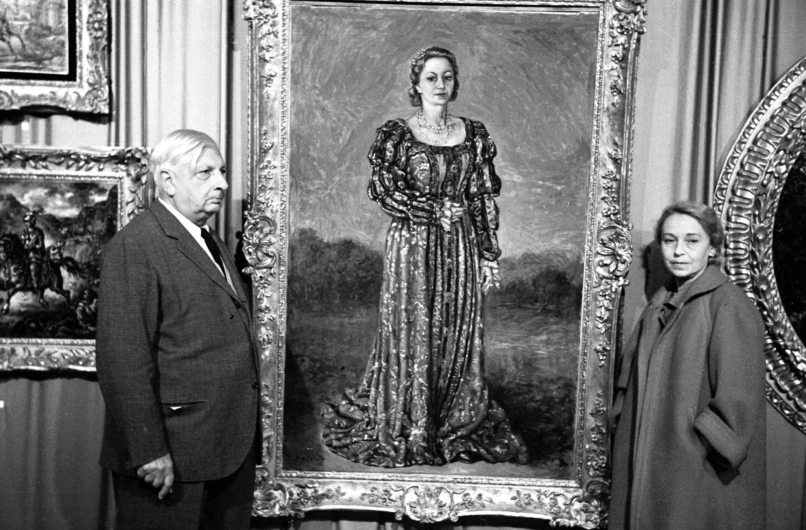 Black and white photograph of an older man and a woman flanking a large gilt-framed oil portrait of a woman in a full-length patterned gown, in a gallery setting