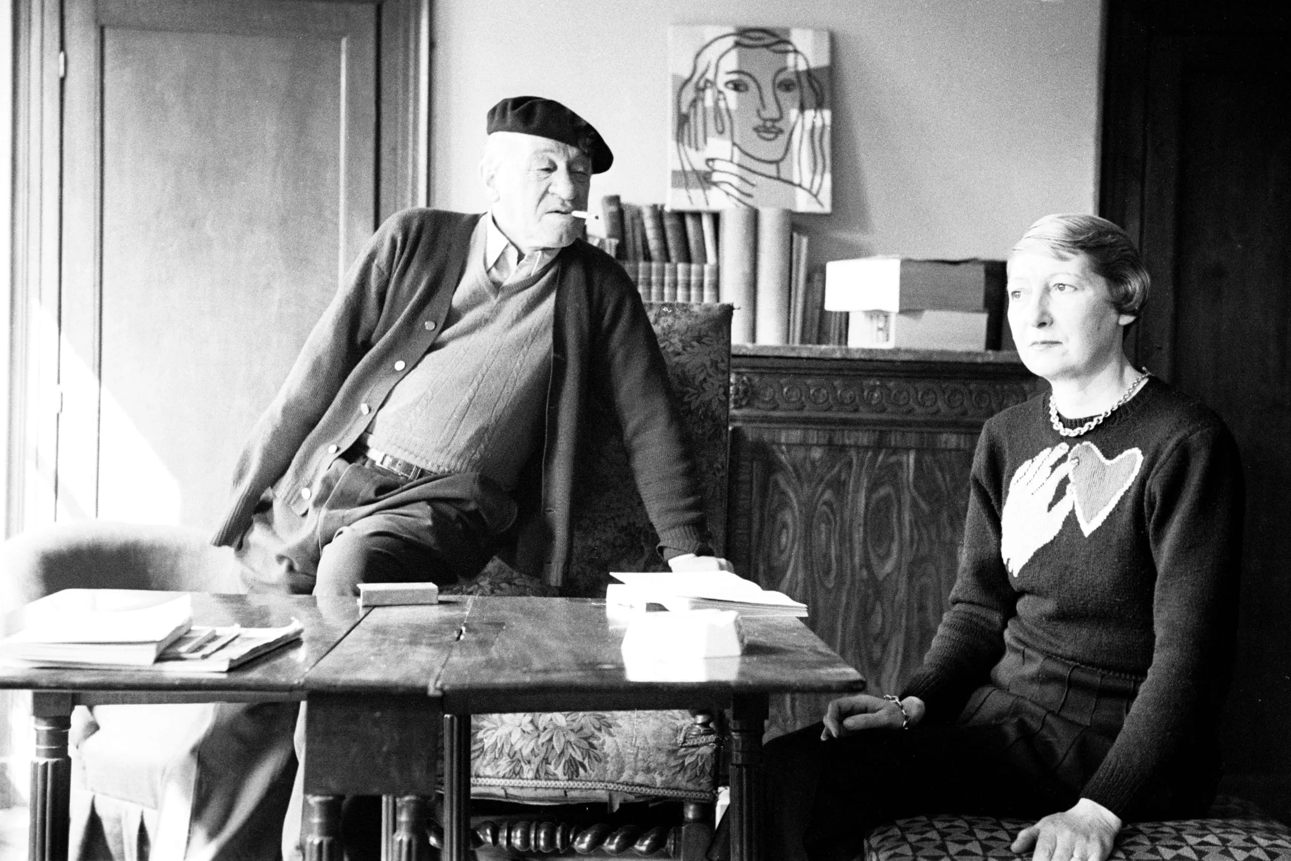 Black and white photograph of an older man in a beret and an older woman in a patterned sweater seated in a book-filled interior