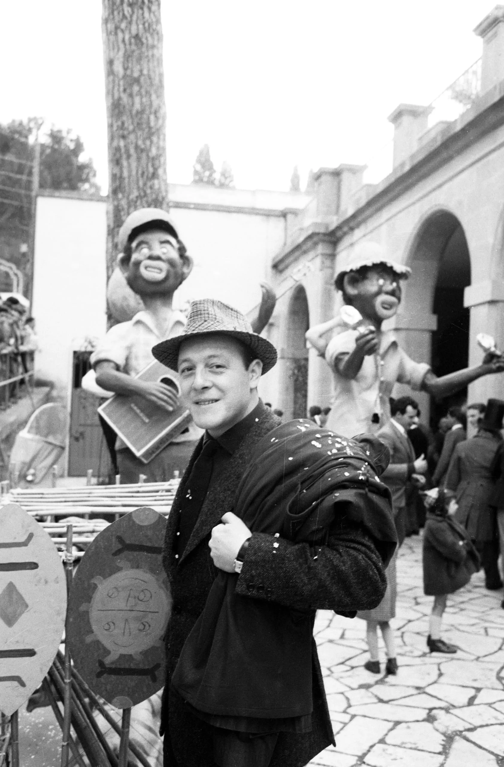 Black and white photograph of a smiling white man in a fedora and dark jacket, standing before two large carnival float figures in an outdoor crowd