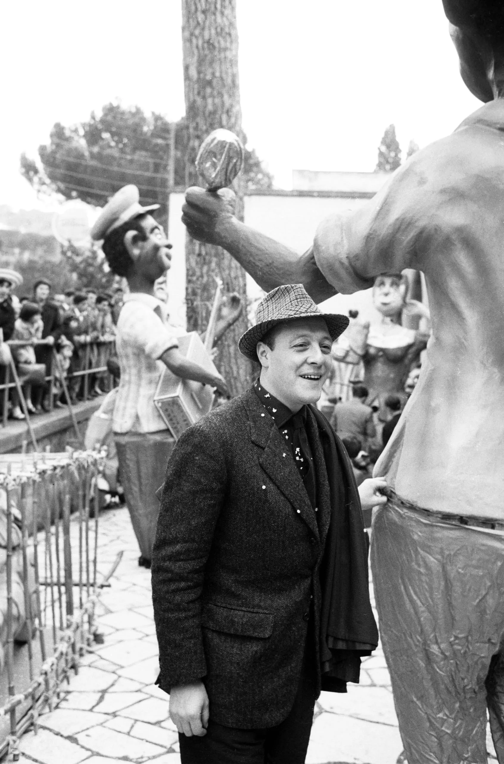 Black and white photograph of a smiling man in a plaid hat and tweed jacket standing among large carnival parade figures outdoors