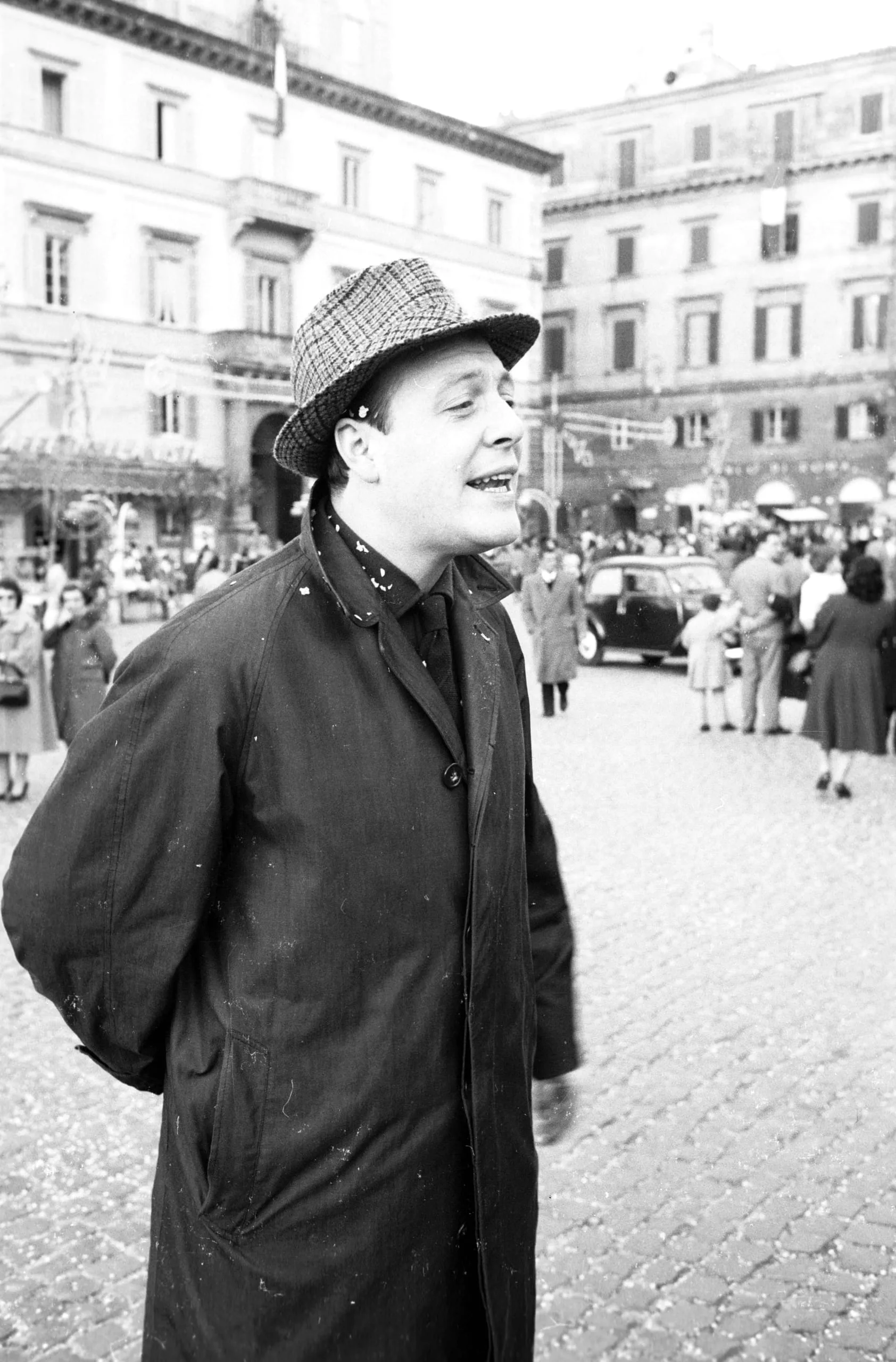 Black and white photograph of a heavyset man in a plaid fedora and dark overcoat standing in a cobblestone piazza, head tilted up and to the right, crowd and historic buildings in the distance