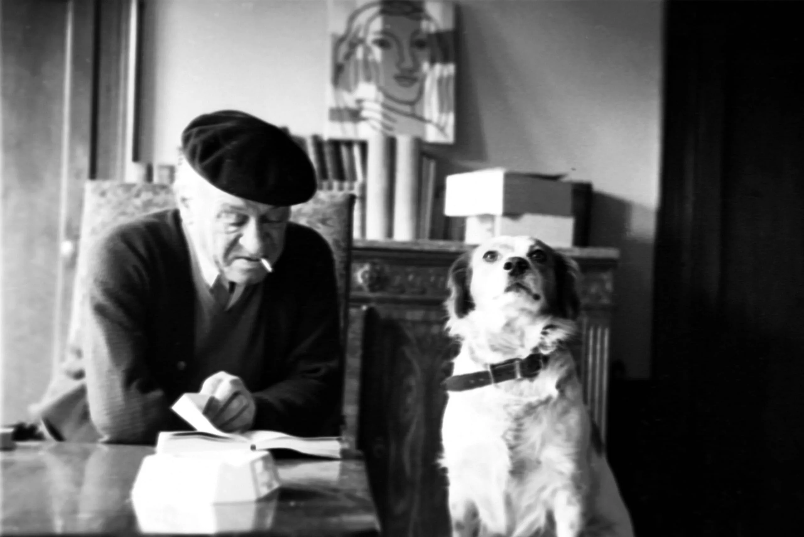 Black and white photograph of an elderly man in a beret leaning over an open book at a table beside a seated spaniel-type dog, with a framed artwork visible on the wall behind them