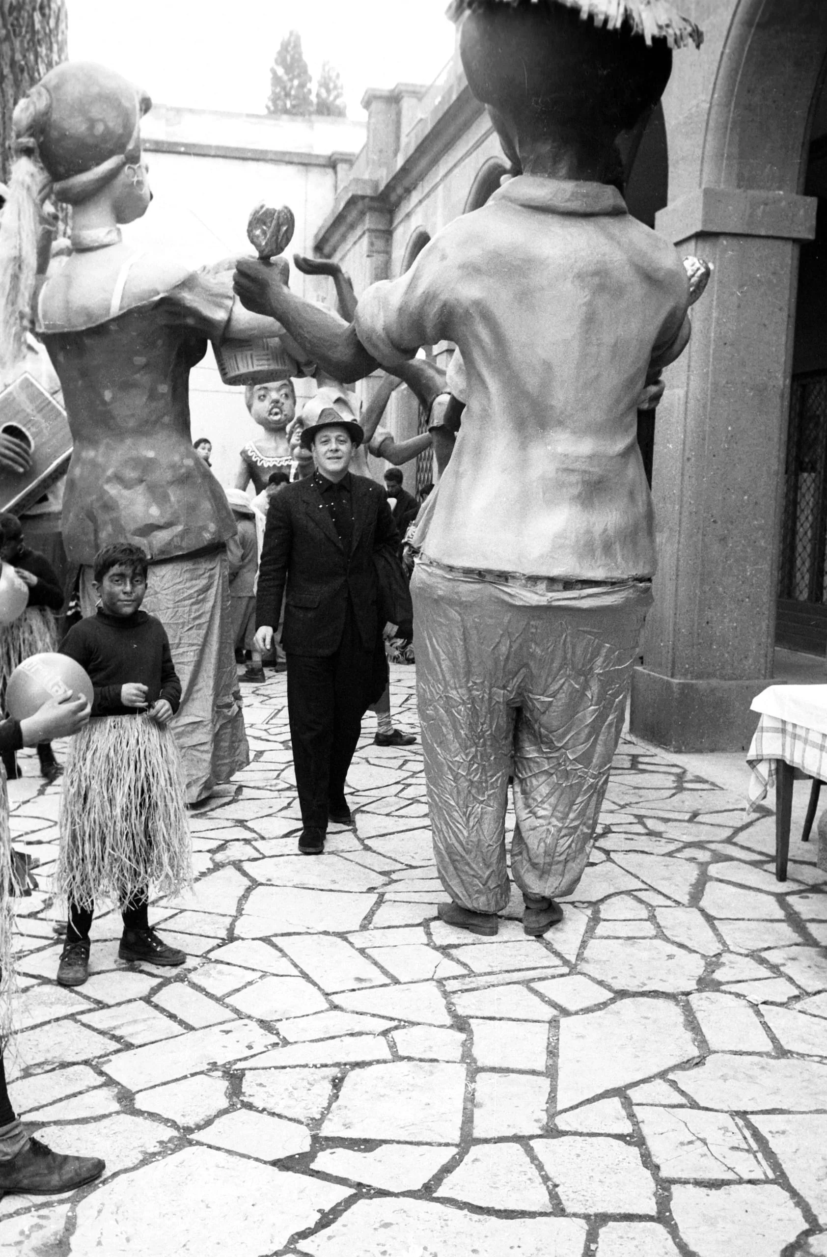 Black and white photograph of two large carnival puppet figures flanking a smiling person in a wide-brimmed hat on a stone-paved courtyard, with a child in a grass skirt nearby