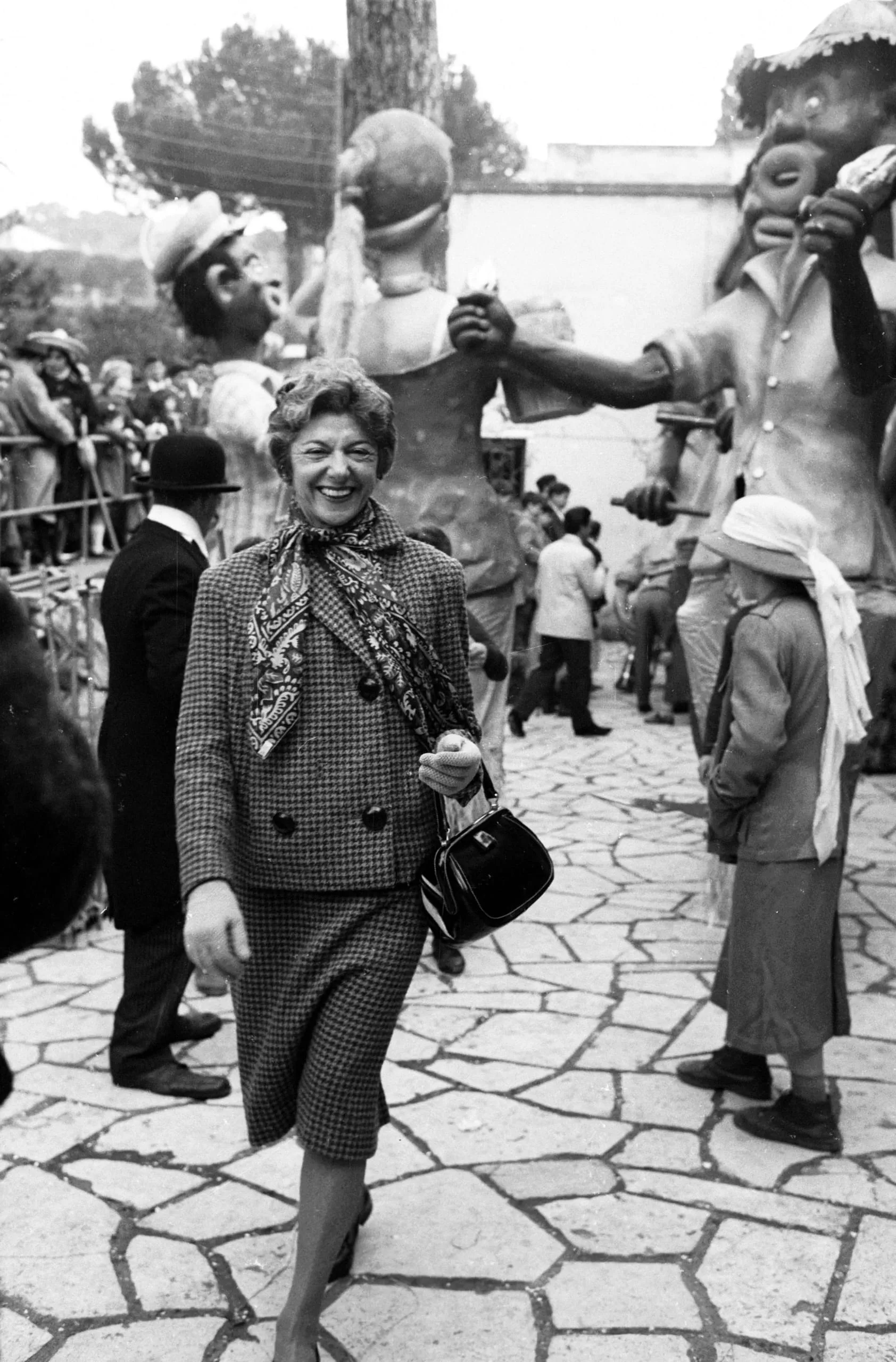Black and white photograph of a woman in a houndstooth suit and silk scarf walking toward the camera, laughing, with oversized carnival float figures looming behind her