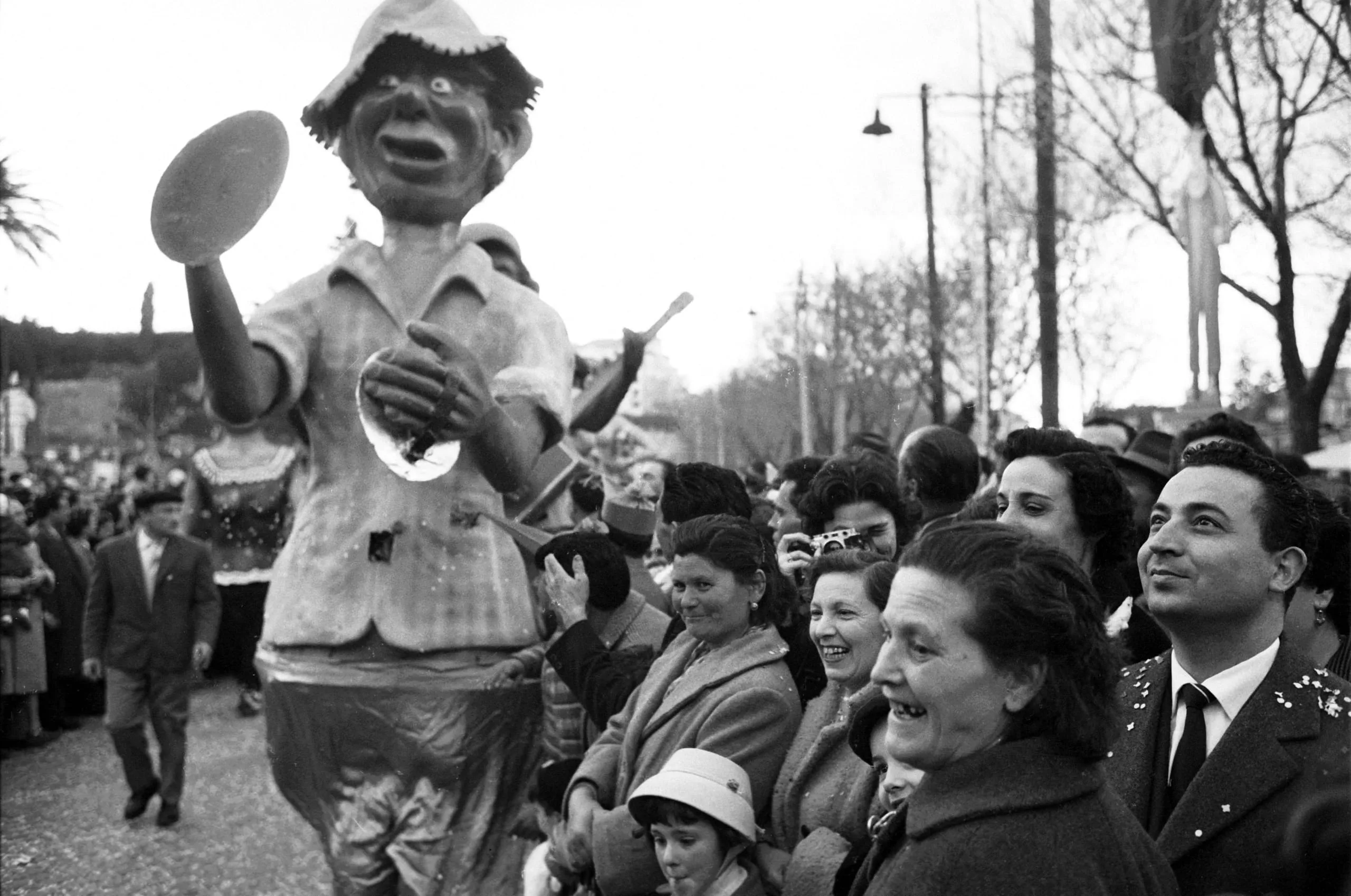 Black and white photograph of a carnival crowd gathered around an oversized papier-mâché parade figure of a child-like character in hat and baggy clothes, holding a round object aloft