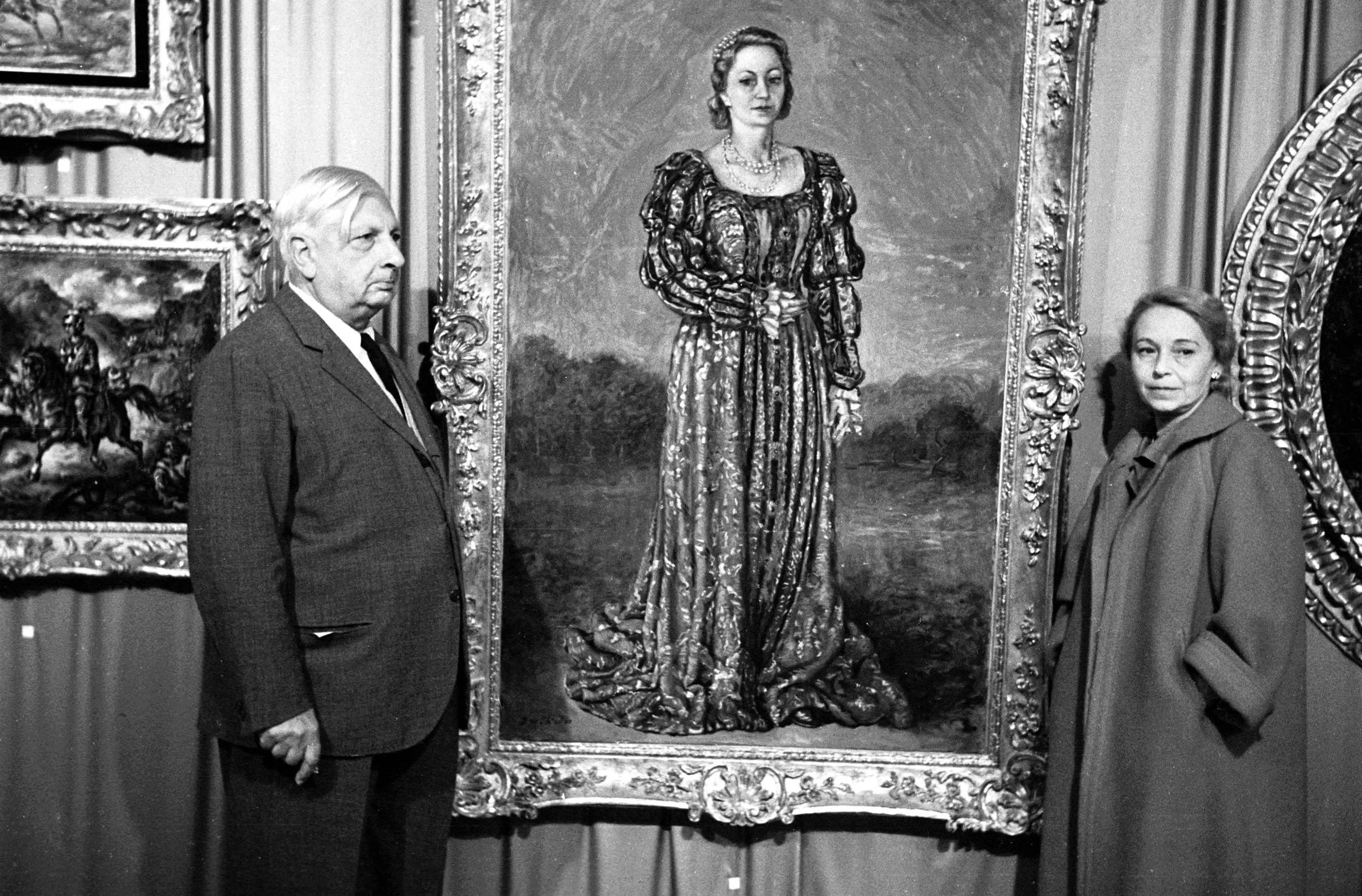 Black and white photograph of a man and woman flanking a large gilt-framed portrait painting of a standing woman in a full-length gown
