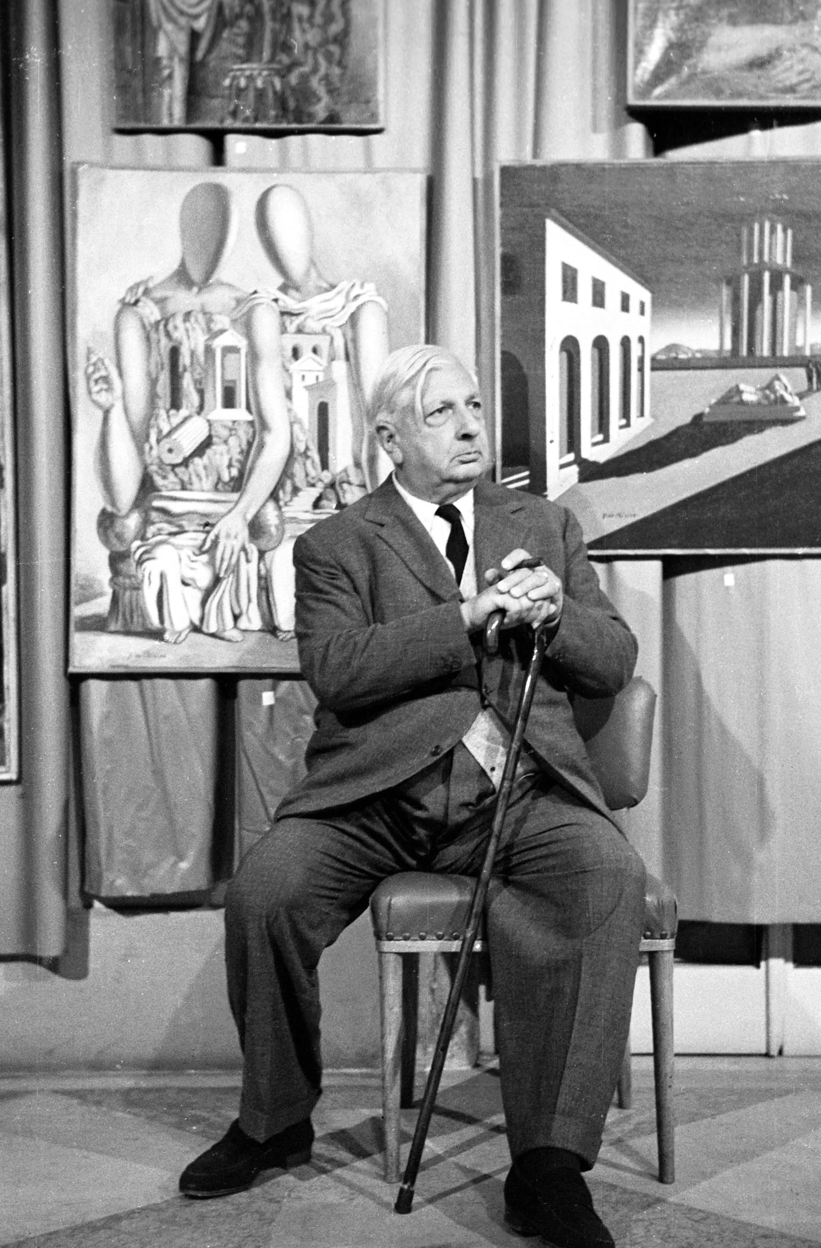 Black and white photograph of an elderly man in a pinstriped suit seated with a cane, surrounded by surrealist paintings on easels