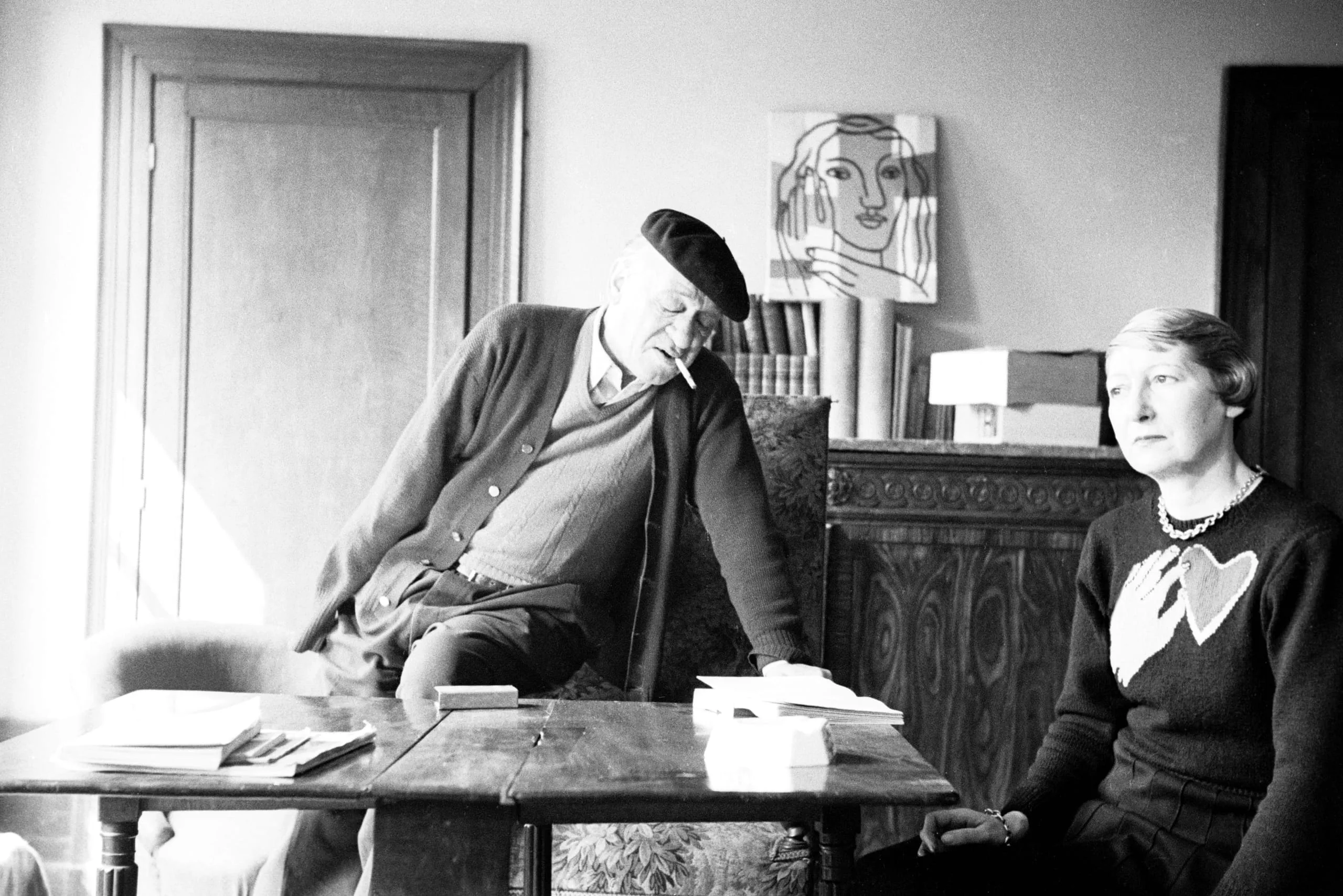 Black and white photograph of two older adults, a man leaning over a paper-strewn table with a cigarette and beret, a woman seated to the right, a modernist line drawing visible on the mantelpiece behind them