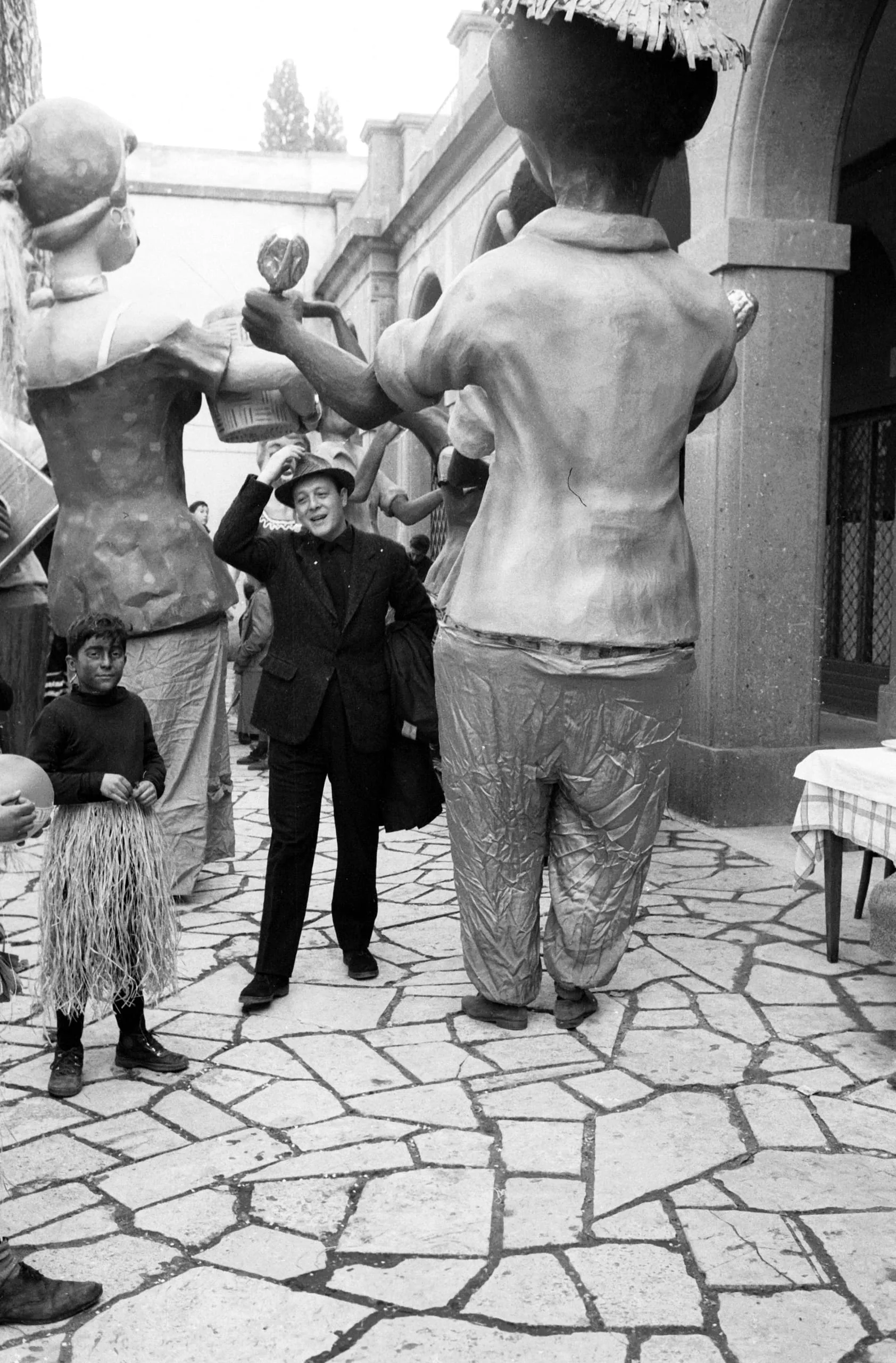 Black and white photograph of a man in a suit and hat surrounded by towering papier-mâché puppet figures in a stone courtyard, with a child in a grass skirt nearby