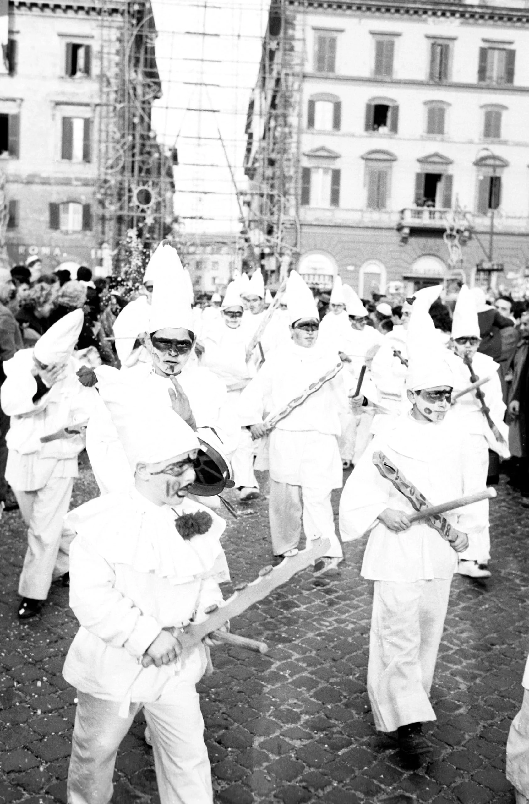 Black and white photograph of a group of costumed figures in white tunics, conical hats, and eye masks processing across a cobblestone plaza, carrying decorated clubs